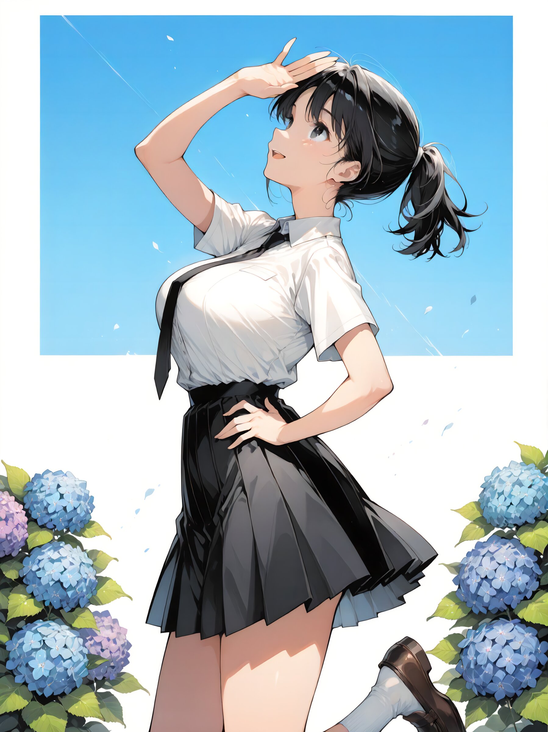 Best quality, Masterpieces, simple background, lots of negative space, delicate anime-style illustration, white background, fine detail, poetic atmosphere, solo, (young girl), cute face and eyes, big breasts, black hair, clear black eyes, single short ponytail hair, cute and lovely, Vigorous, lively, and spontaneous personality, Short-sleeved white collared mandarin shirt, black necktie, black pleated skirt, white socks, loafers, smile, open mouth, shading eyes, Standing with hands on hips, looking up, from side, hydrangea flowers, cowboy shot, (blue sky), fresh breeze, cinematic angle