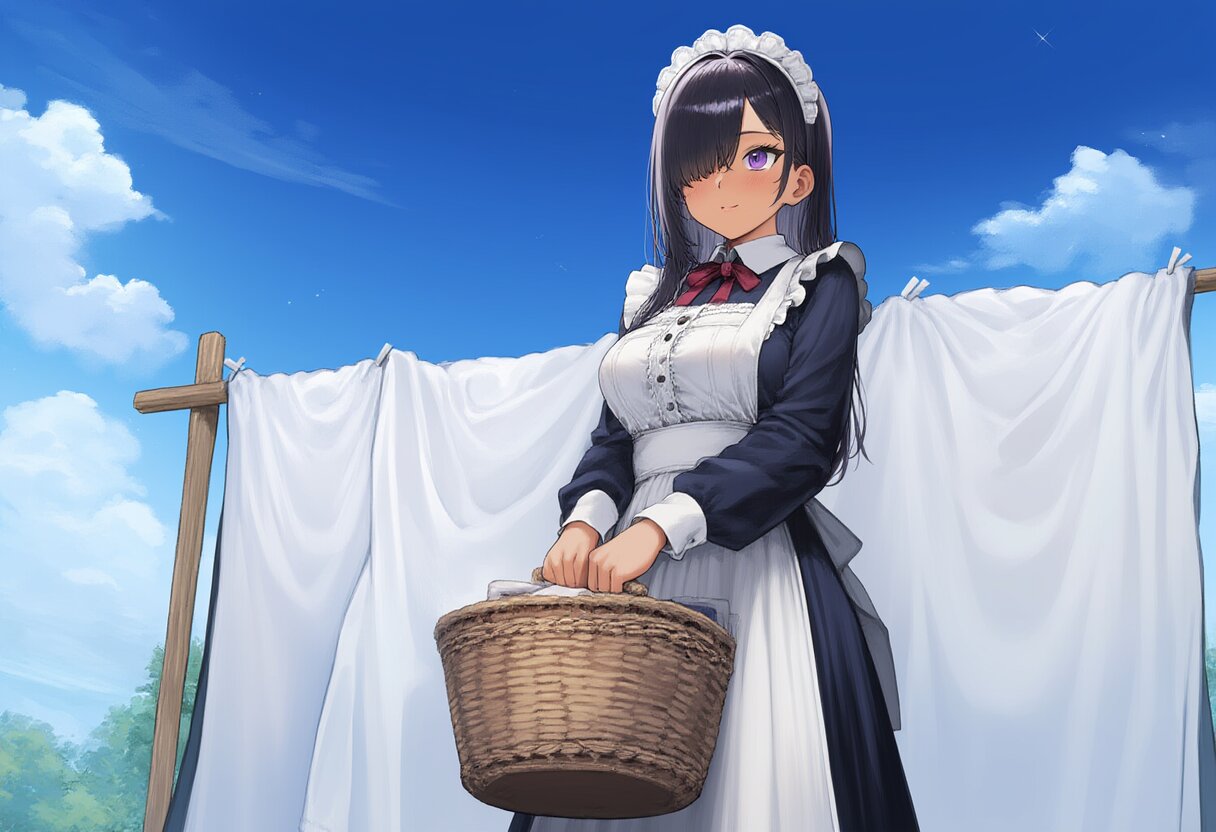 (traditional media:1.5),(sepia:1.8),masterpiece,best quality,ultra detailed,rating:general,best quality, very aesthetic,absurdres,girl,tall,large breasts,{{{{{Brown Skin}}}}},purple eyes, {{black hair}},{straight hair},long hair,Hair over the right eye:1.2,hair over one eye,sideburns,faint lips,Classic Maid,long skirt,Frilled head dress,Laundry, drying laundry, blue sky, clear May day,Looking up at the sky, washed sheets, laundry on a clothesline,solar,light smile,Hold a laundry basket