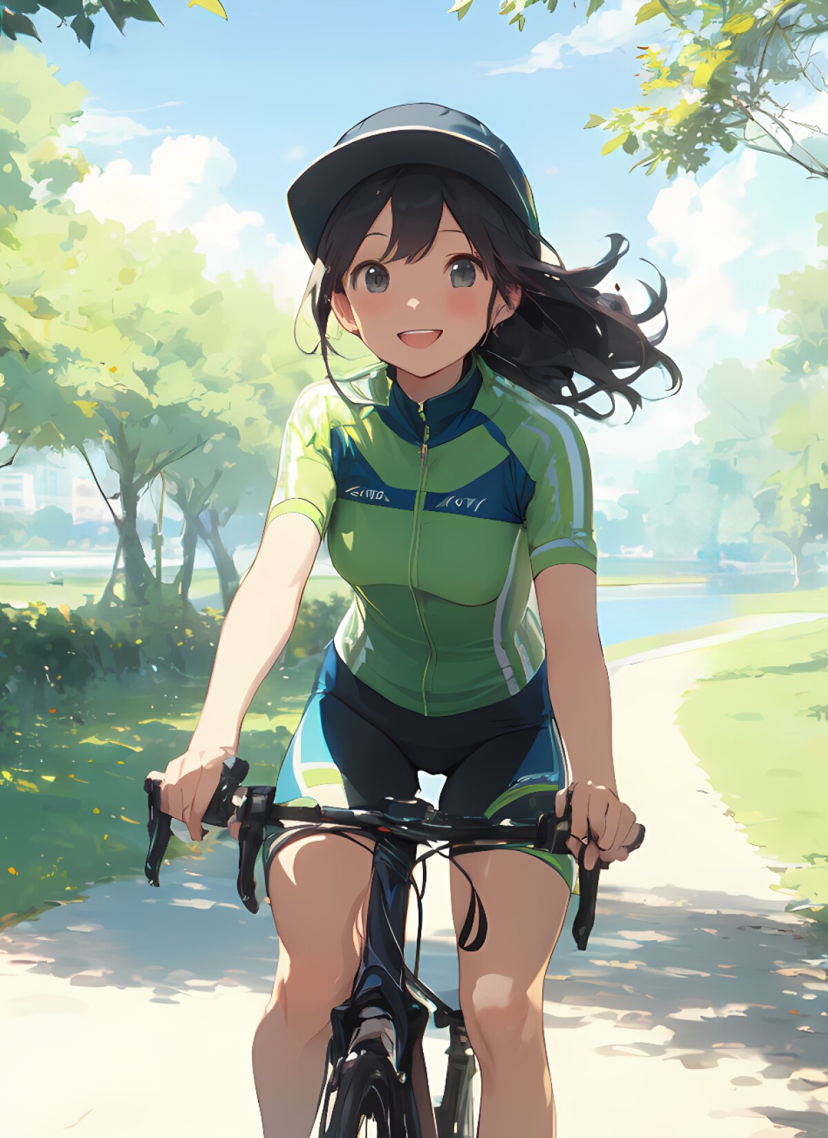 masterpiece, best quality, 1girl, cycling along the river,wide blue sky,fresh,May,cycling wear,fun,happy,smile,wind,green trees,