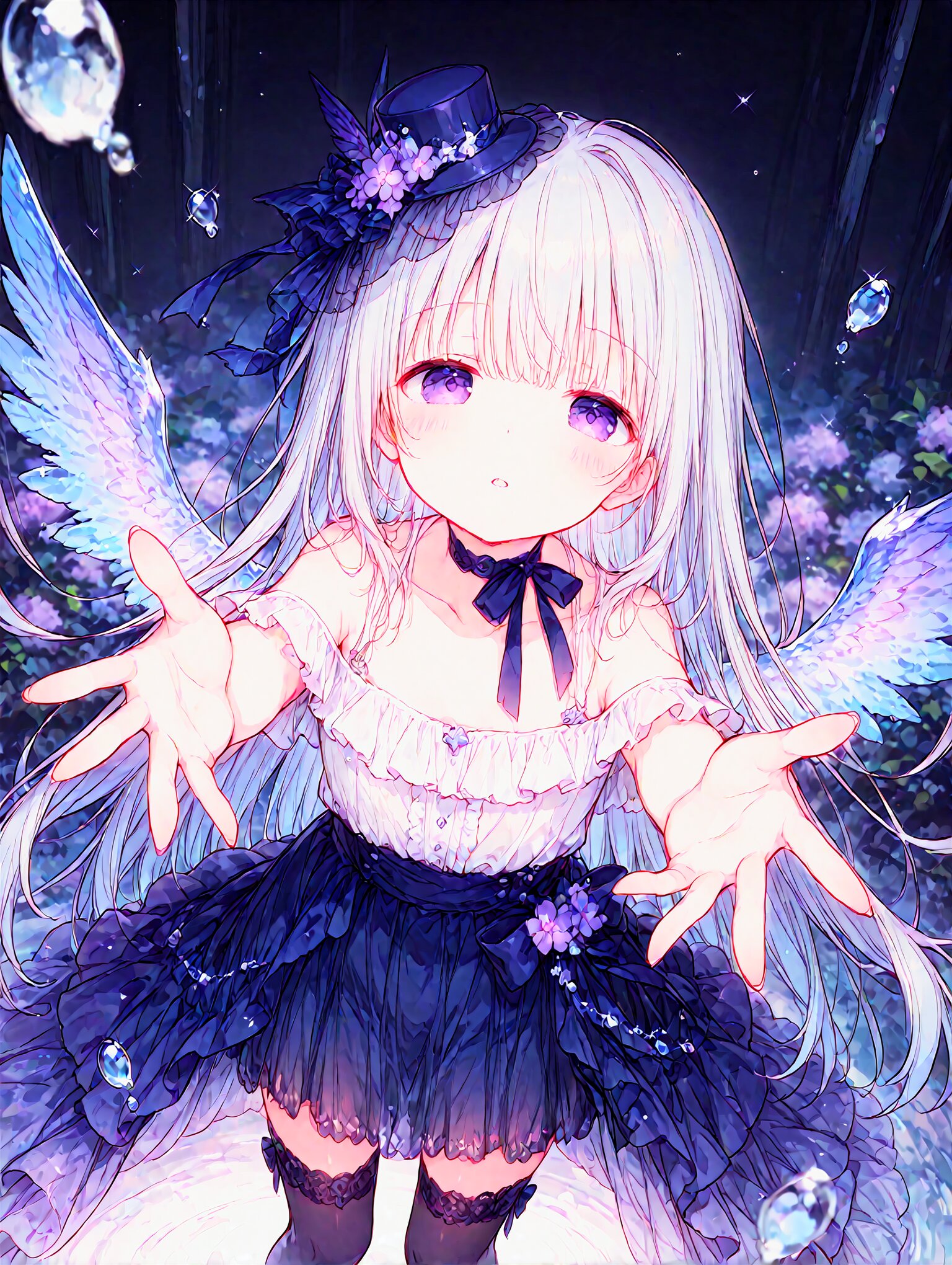 beautiful detailed background, best quality, (pale color,:0.7) scenery, detailed, intricate, backlighting, watercolor \(medium\), solo, purple theme,dark theme, blurry, collarbone, parted lips,(Expressionless:0.8), big eyes,(half-closed eyes:0.8), tareme, pale purple eyes, thighhighs, (silver hair:1.1), (dark blue hair colored inner hair:0.8), long hair,very long hair eyebrows visible through hair, wave hand, sparkle, (white off-shoulder) and (dark blue skirt,:1.2) see-through veil, mini hat, blue strapping ribbon and bow, frills, strapping ribbon, choker, round lighting, temptation, crystal, reaching, zettairyouiki. looking at viewer, looking away, looking at viewer, below wind,, from above, see-through, flower, water drop, (water wings:1.2), (lilac:1.1) <lora:noline-16oa:-0.5> <lora:sdxl-shadow_01:-1.2> <lora:sdxl2-flat2-512b:-0.7>,