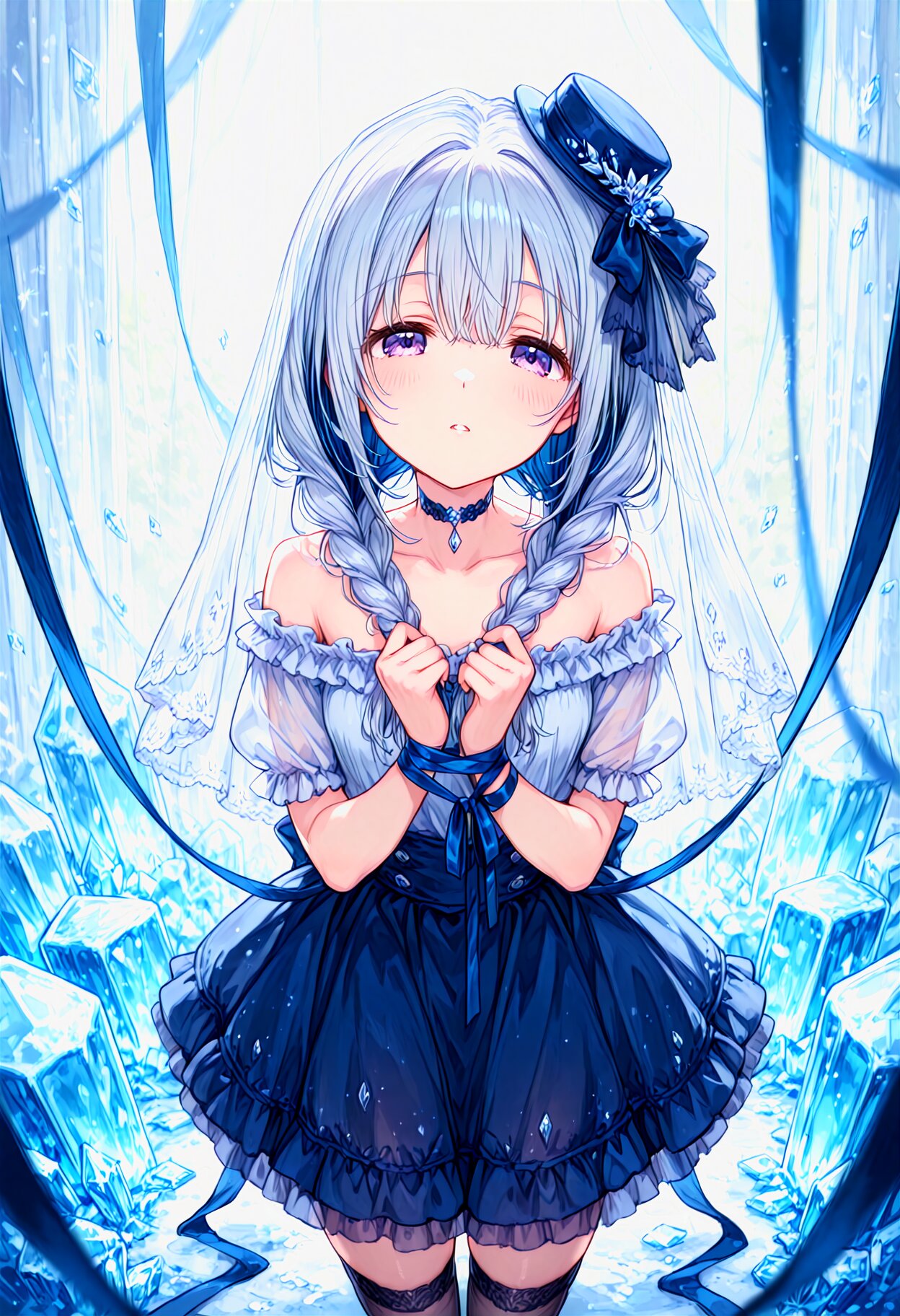 beautiful detailed background, best quality, (pale color:0.8), solo, collarbone, parted lips,(Expressionless:0.8), big eyes,(half-closed eyes:0.8), tareme, pale purple eyes, thighhighs, (silver hair:1.1), (dark blue hair colored inner hair:0.8), eyebrows visible through hair, twin braids, front braid, playing with her hair, (white off-shoulder:1.1) and dark blue skirt, see-through veil, mini hat, blue strapping ribbon and bow, frills, strapping ribbon, choker, round lighting, temptation, crystal, many ice block, standing, , light shafts,, see-through, <lora:sdxl-shadow_01:-0.5> <lora:noline-16oa:-0.5> <lora:sdxl2-flat2-512b:-0.7>