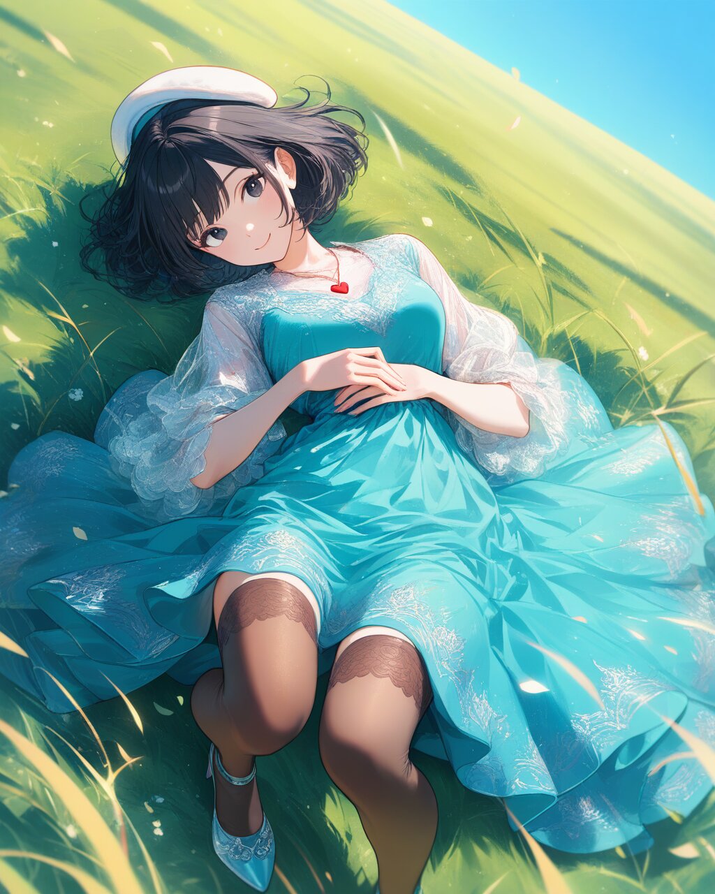 masterpiece, best quality, ultra detailed, 1woman, black bob, black eyes, aqua dress, white beret, red heart necklace, brown thigh highs, high heels, smile, on back, clear blue sky, sunny afternoon, grasslands, from above