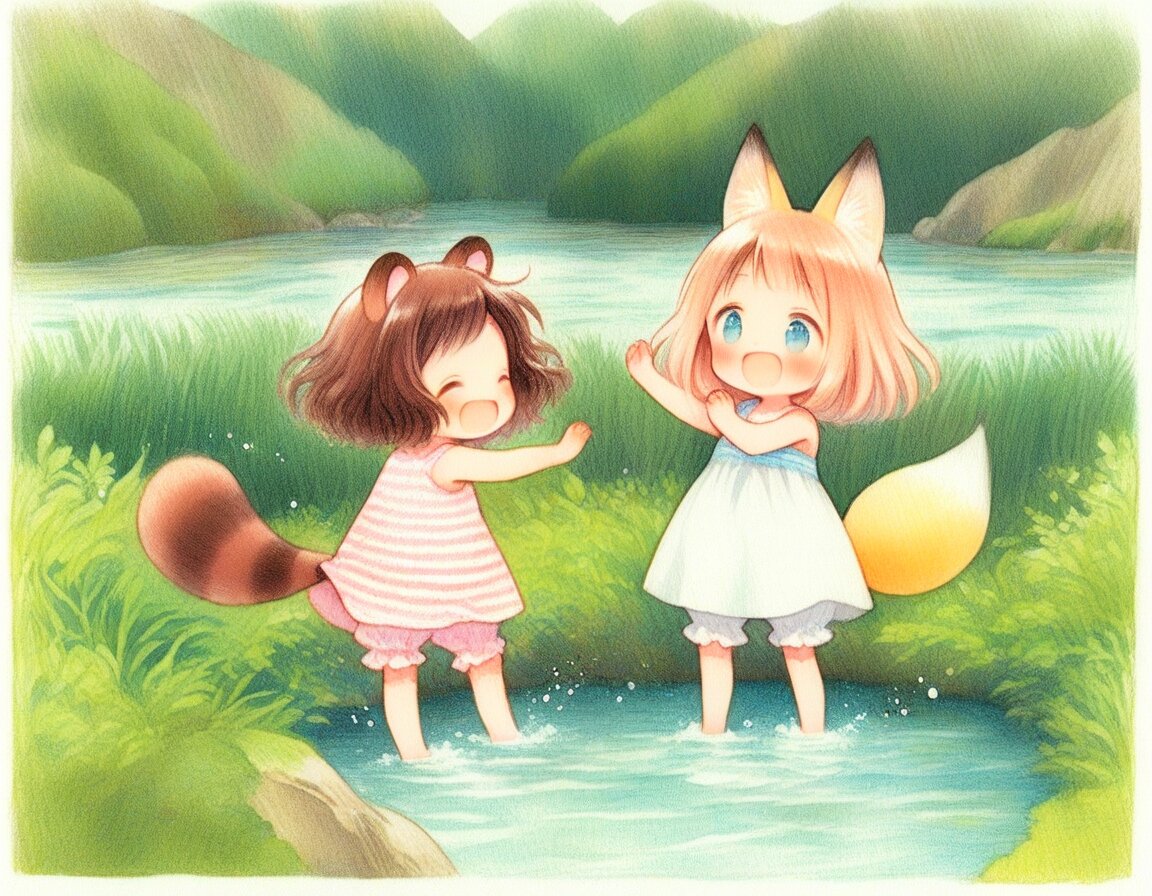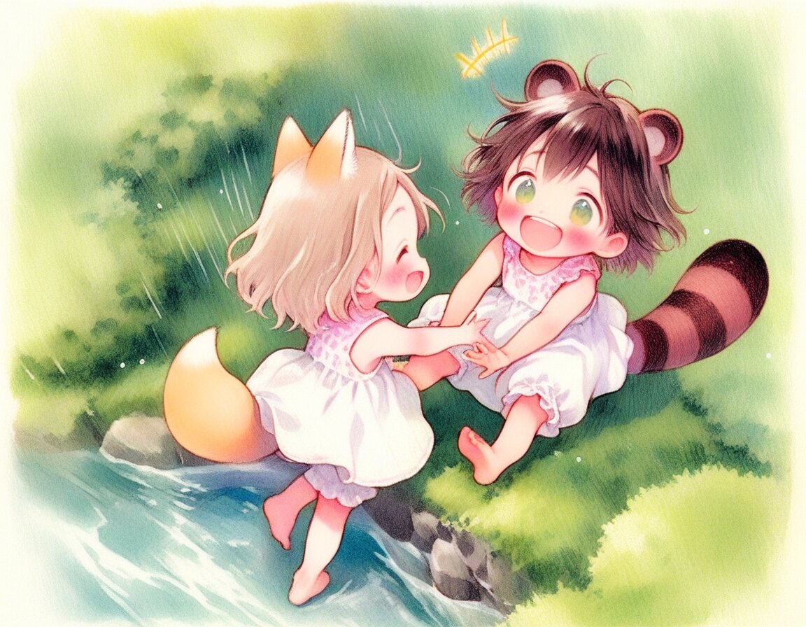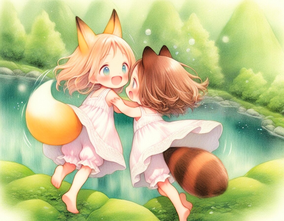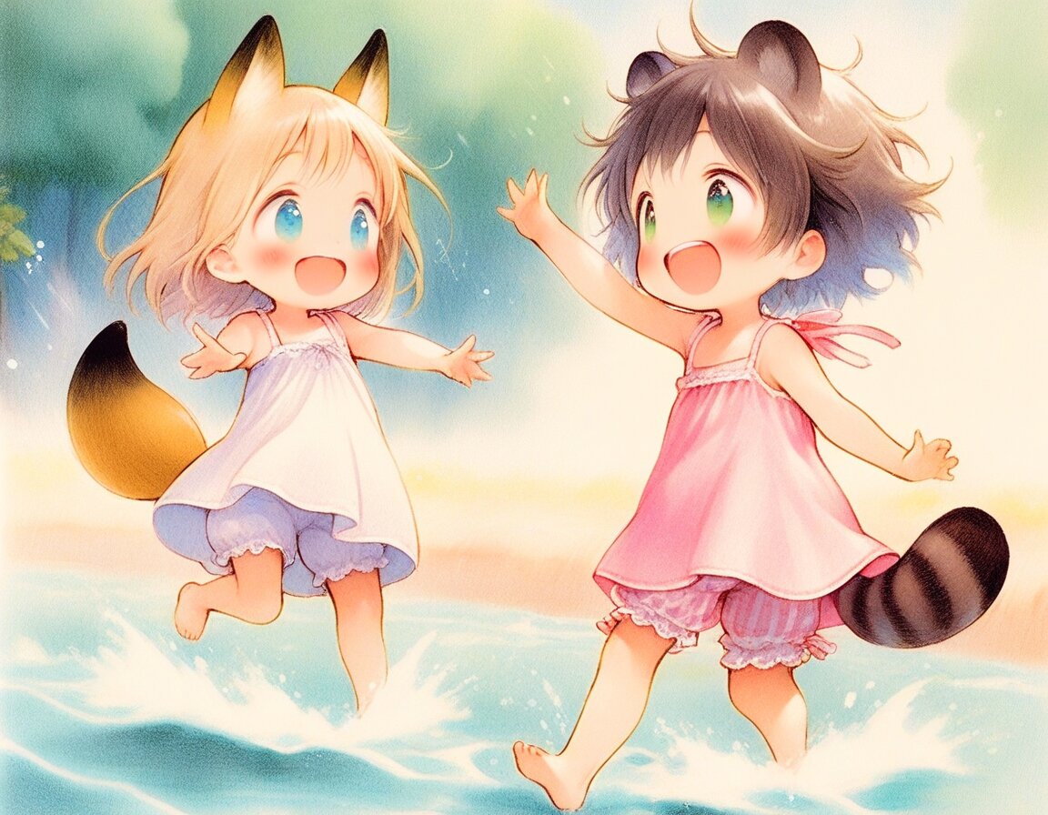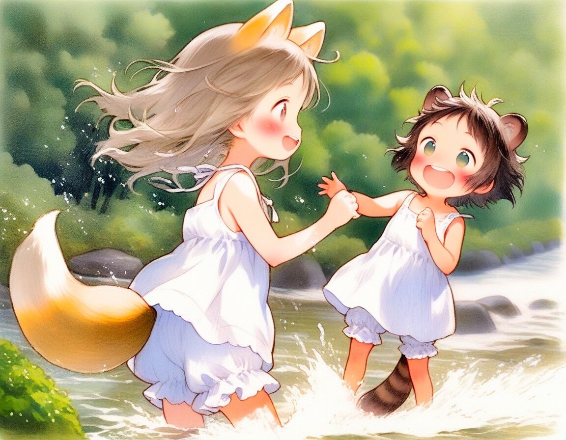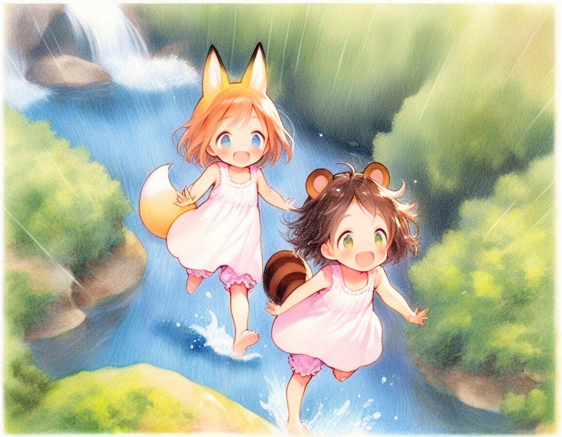2girls, loli, mid, general, (oyari ashito:0.01), (barasui:0.01), traditional media, picturebook-style, (colored pencil drawing), pastel colors, soft tone, (blurred boundaries, drawing lines, Paper texture), cute, deformed, ultra-detailed background, (masterpiece, best quality, high score, great score), dynamic pose, dynamic angle, dynamic composition, dynamic motion, cowboy shot, from above , In the mountains, rich in nature, Green trees, Beautiful nature, mountain stream, Splashing water, Barefoot, barefoot, playing in the water, sprinkle water on, (white sundress, Ruffled bloomers), <lora:add-detail-xl:1> <lora:sdxl-hairdetailer_01:1> BREAK 2girls, loli, light brown hair, medium hair, bangs, blue eyes, (light brown fox ears, Light brown fox tail with white tip, petite), happy, smile, fun, , BREAK 2girls, loli, dark brown hair, short hair, messy hair, bangs, green eyes, tareme, (dark brown raccoon ears, dark brown raccoon tail with striped pattern), laughing, happy, enjoy, ,