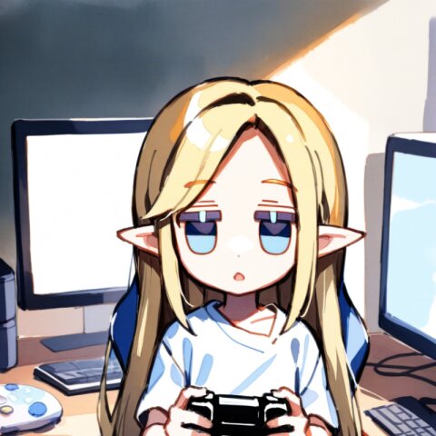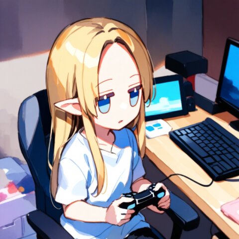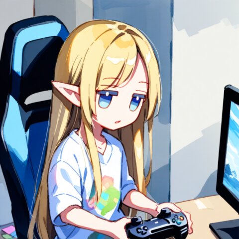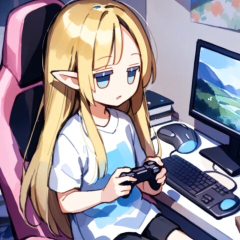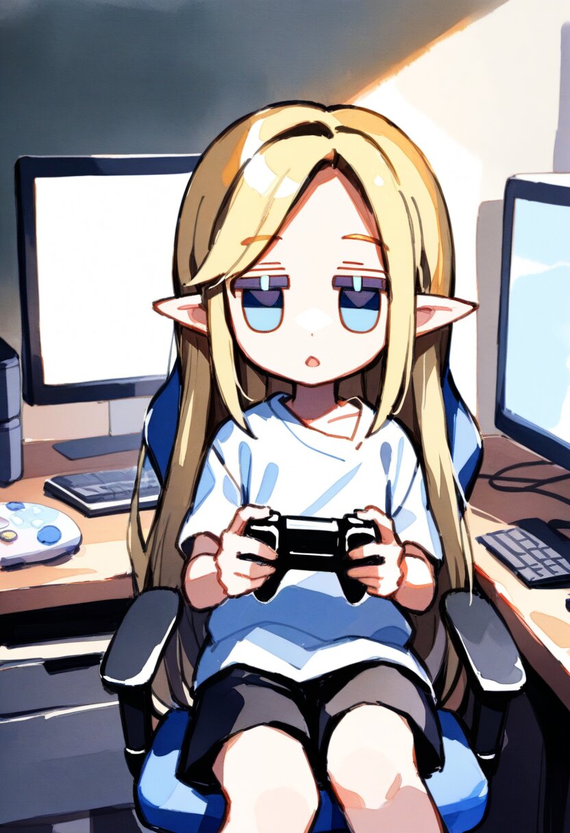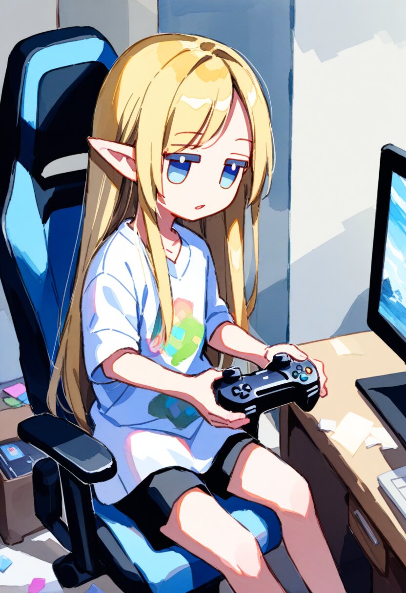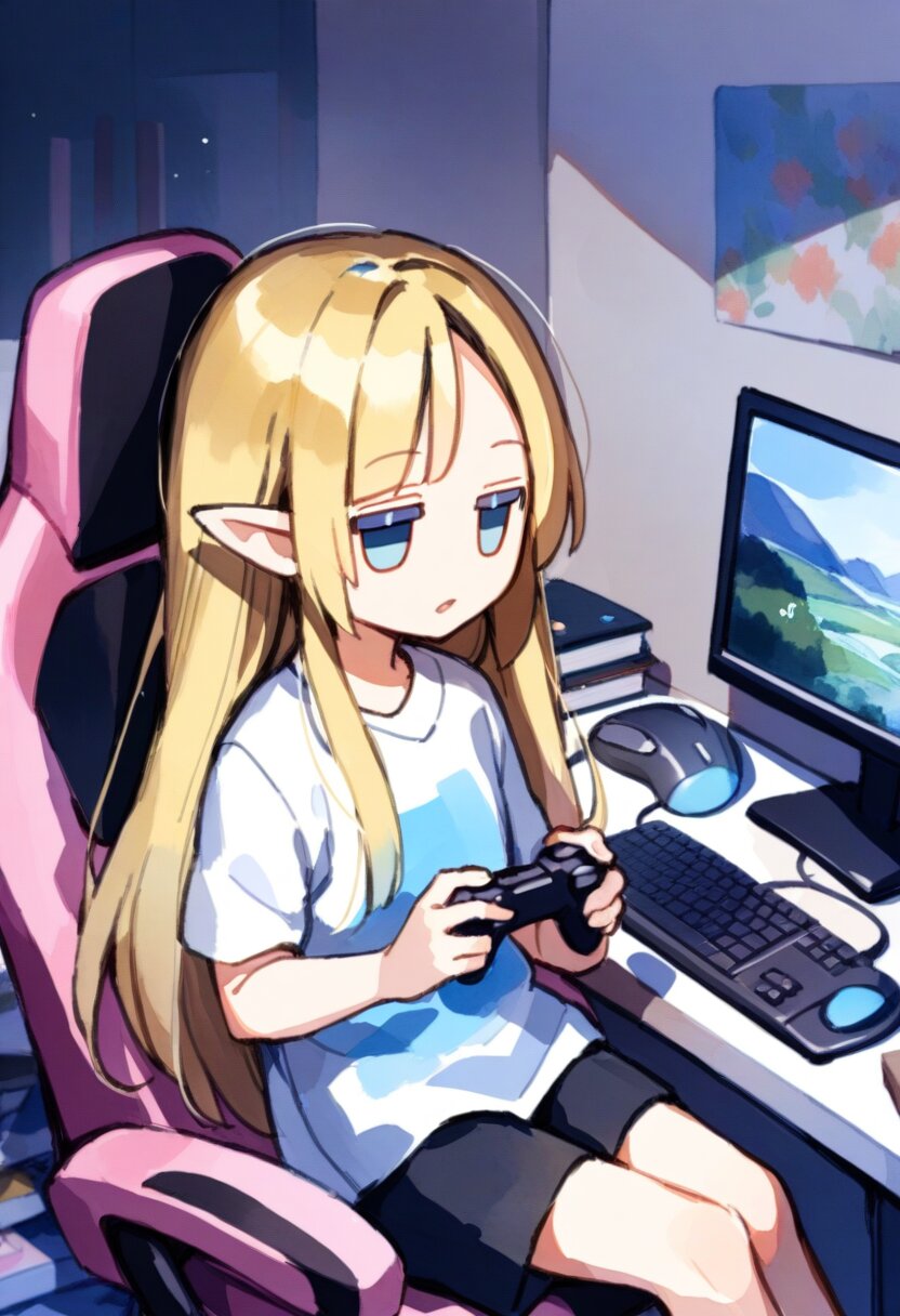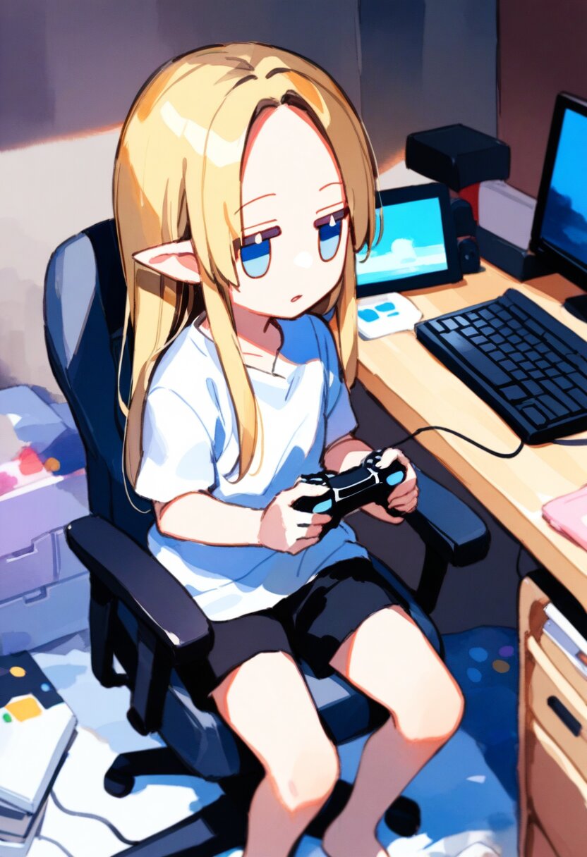 <lora:inmnstylexl:1>, best quality, masterpiece, very aesthetic, general, watercolor painting, 1girl, 10 years old, blonde hair, long hair, jitome, blue eyes, pointy ears, parted lips, loose shirt, white printed shirt, short sleeves, black shorts, pc, desk, sitting on gaming chair, holding game controller, messy room
