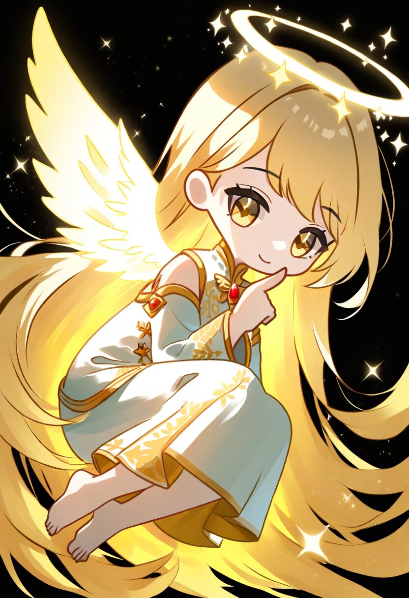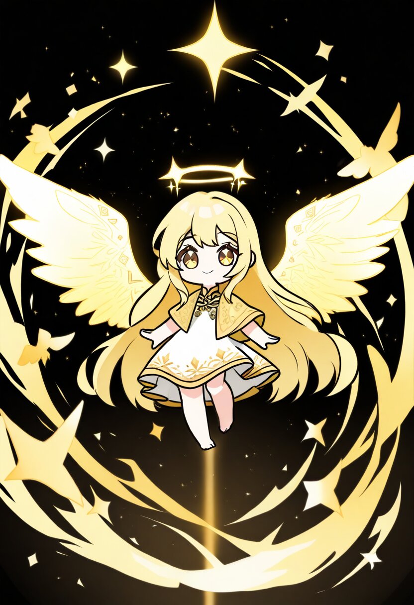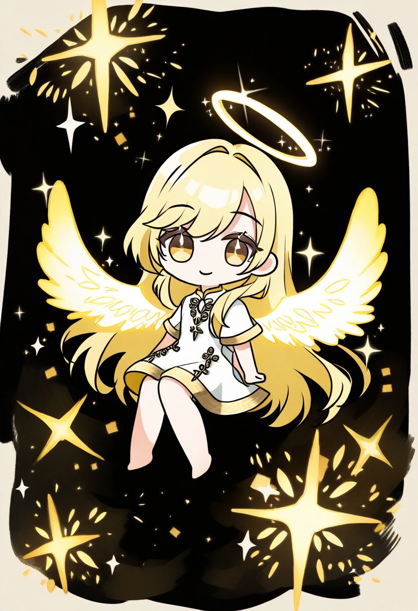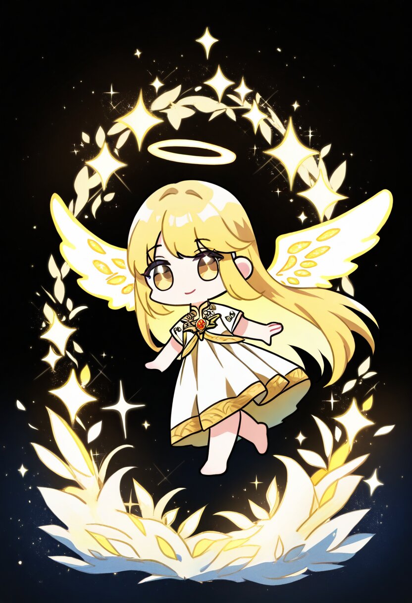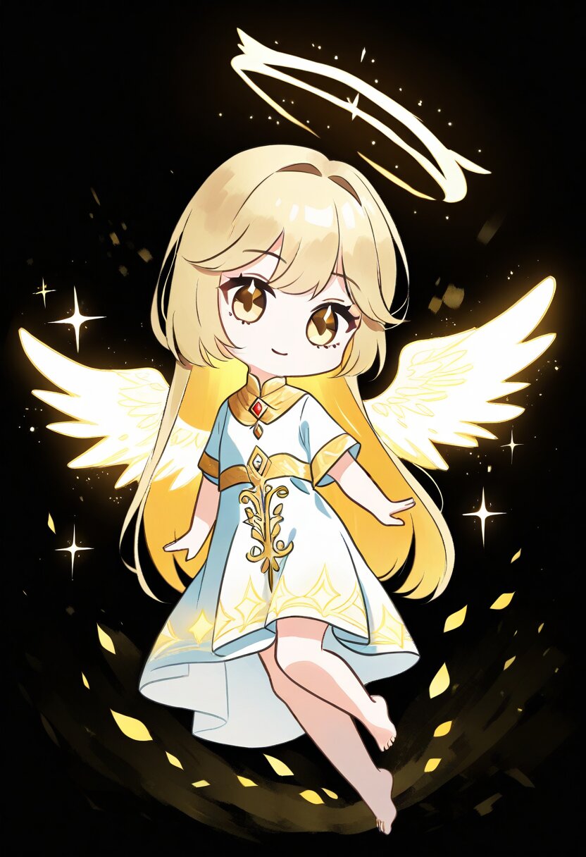 <lora:inmnsylexl4:1>best quality, masterpiece, very aesthetic, general, watercolor painting, chibi, 1girl, blonde hair, long hair, golden eyes, golden embroidery white dress, glowing golden wings, glowing angel halo, barefoot, smile, sparkling aura, black background