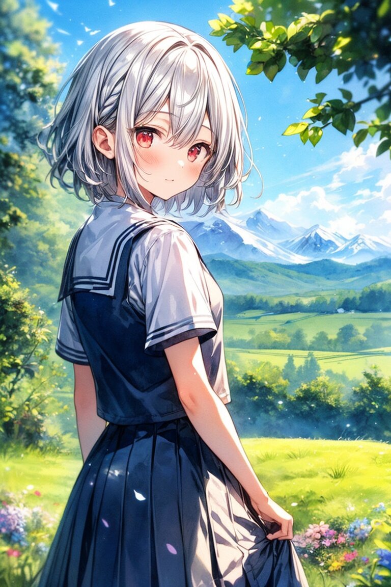 girl,young,cute,shorthair,silver hair,watercolor,colorful, ,countryside,waiking,short sleeve, , ,skirt,red eyes,summer, ,flower,girl,ojou-sama,countryside <lora:flat2:-0.9> <lora:deluster2:-0.5>,mountain,day,forest