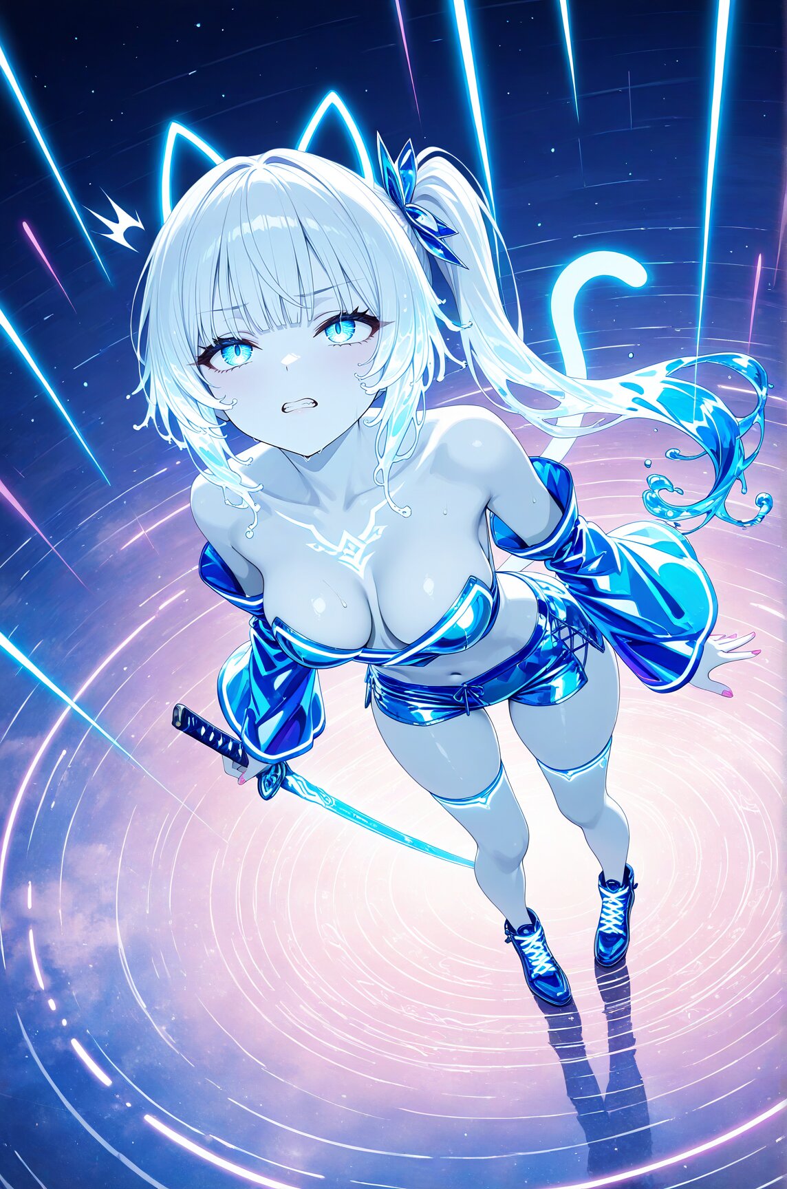 Anime illustration, CG art, 3D model, 3D rendering, 3D skin texture, high detail, depth of field, 1 person, cat ears, cat tail, hime cut, side ponytail, slanted eyes, sky blue eyes, white skin, gothic lolita, 8K, masterpiece, best quality, amazing quality, very aesthetic, (volumetric lighting), overexposed,