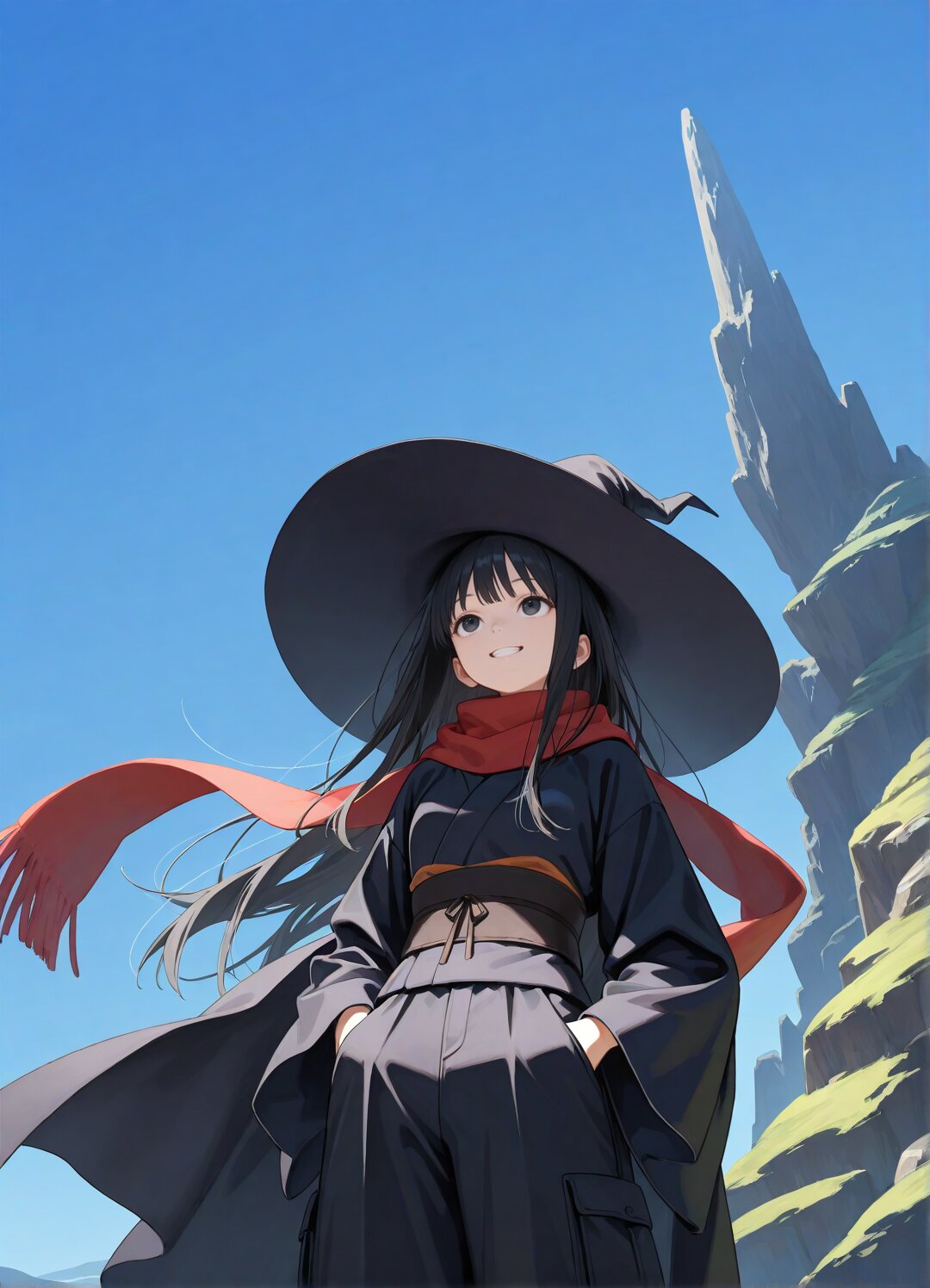masterpiece,best quality,highres,highly detailed,detailed eyes,general,blue sky,clear sky,from below,wide shot,1girl,solo,17yo,(hands in pockets,black Witch hat,long red scarf,grin,light smile),cute girl,slender,small breasts,very long sleeves,black hair,long hair,bangs,black eyes,Witch girl,(long black Witch cloak, long black Witch robe, black obi,long black cargo pants),boots,slender girl,upper body,Very wide plain,beautiful detailed landscape,looking up,fantasy,