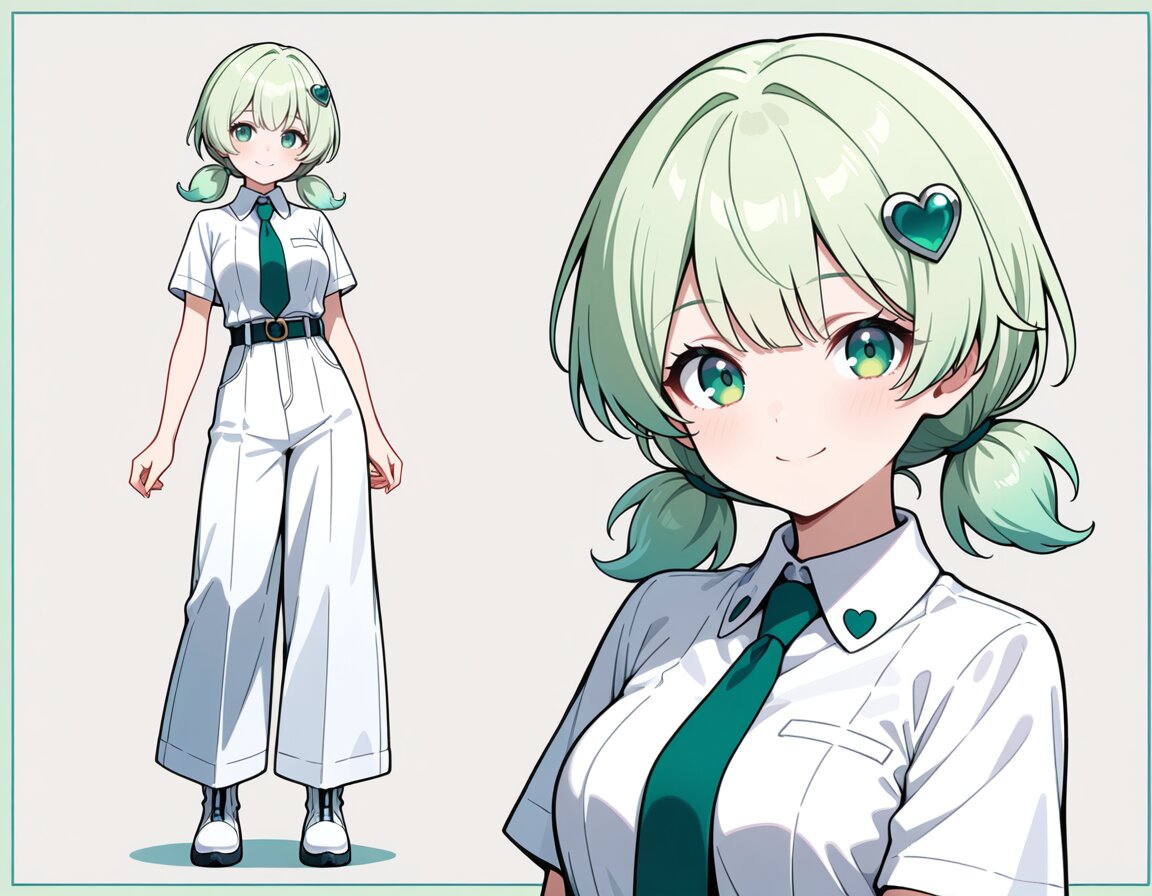 masterpiece,best quality,highres,highly detailed,detailed eyes,general,Character sheet,three view drawing,simple background,1girl,solo,cute,light green hair,short hair,short twintails,low twintails,a green hair ornament,a heart-shaped hair ornament,green eyes,medium breasts,smile,short sleeves,white blouse,green necktie,long white pants,belt,white boots,slender girl,