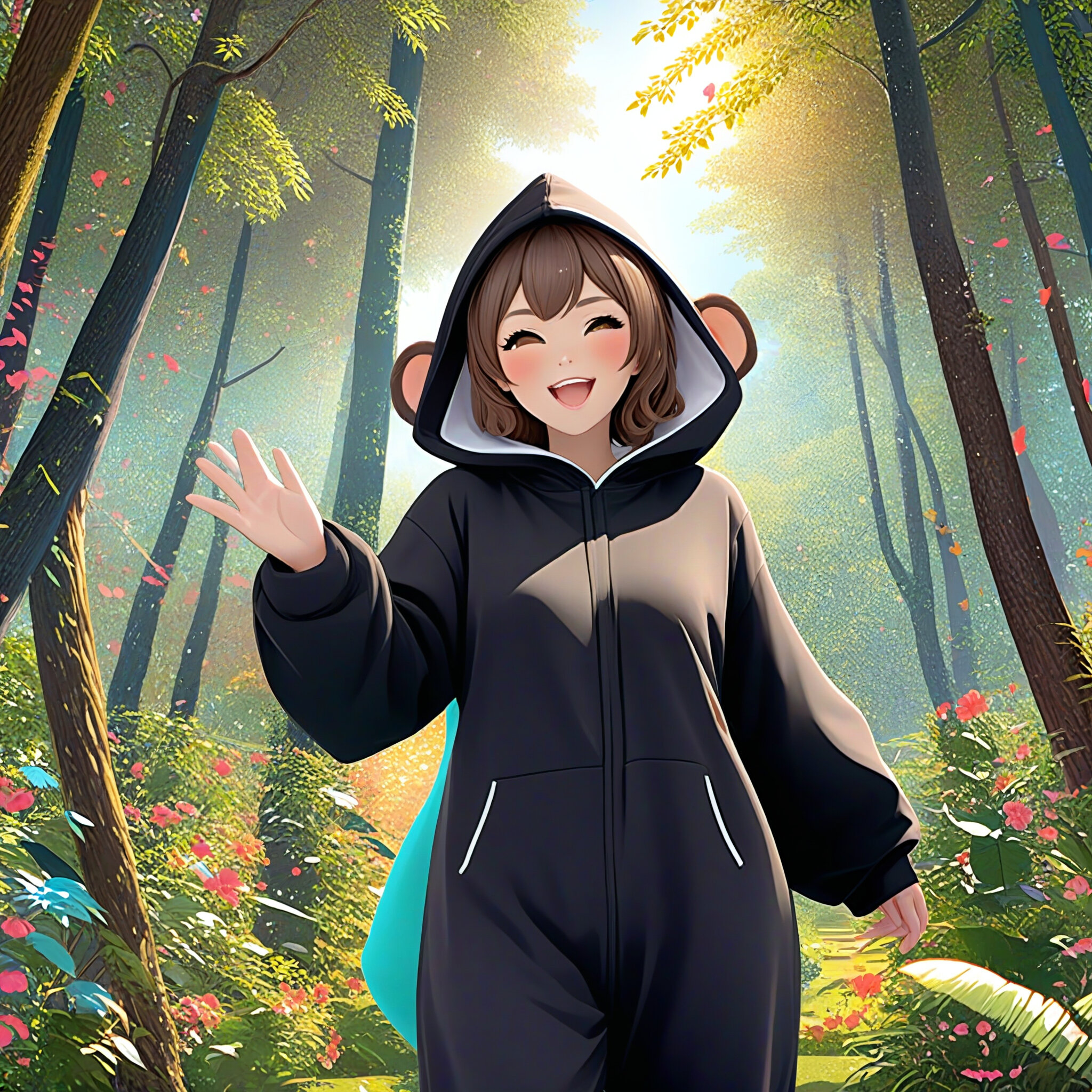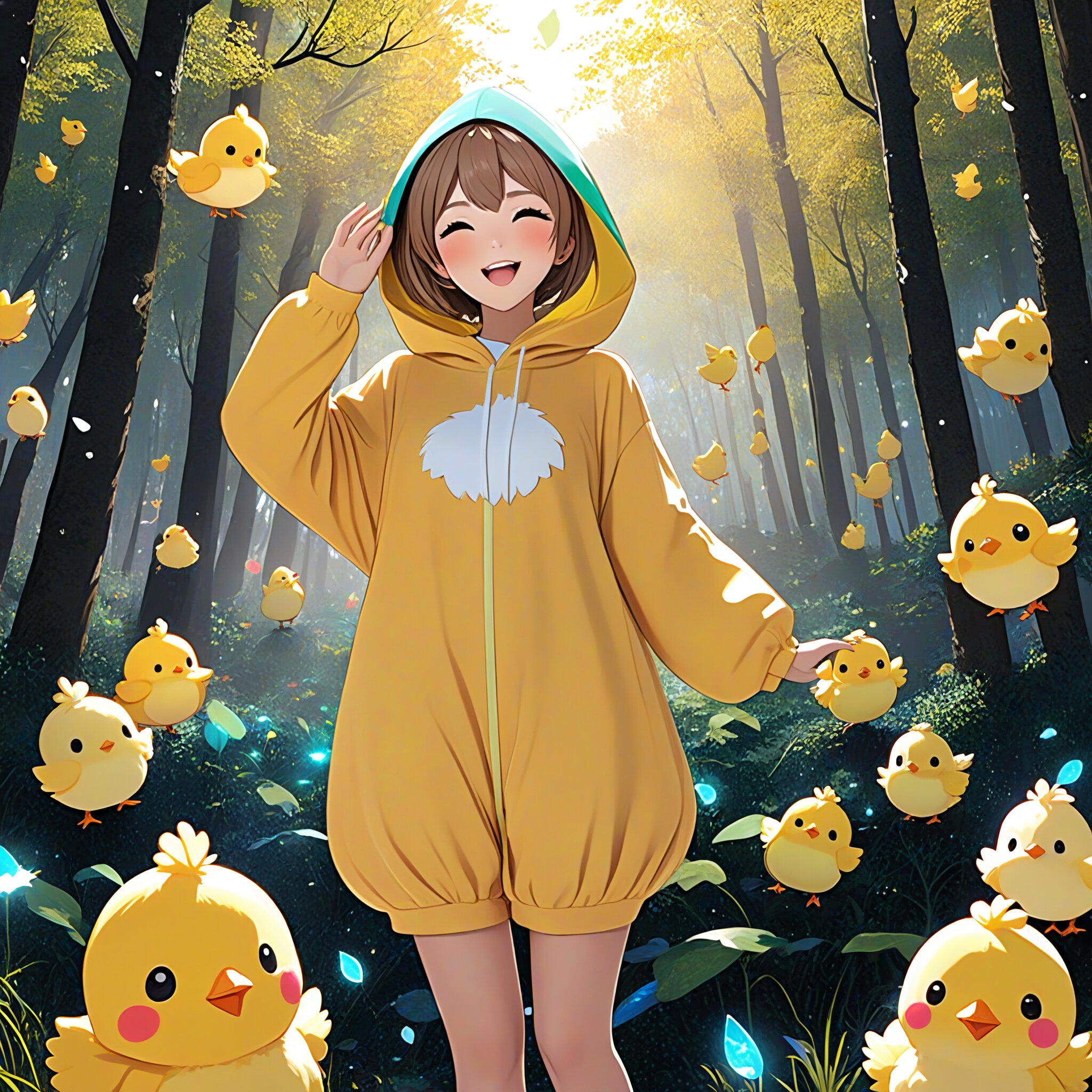 <lora:showing hands:0.5> masterpiece, animation style, anime colored, illustration, Chick kigurumi with comical design, full body kigurumi, break in the magical forest, oversized, relaxed silhouette, (white soft texture),Chick head hood with a cute Chick motif design, break Chick teeth made of soft white fabric,pastel big slippers,laugh, beautiful faces, 1 lady, middles breast, smile, Many Chicks are singing and dancing together, break in heat, magic particles, lapis lazuri, (green particles:1.1), light particles