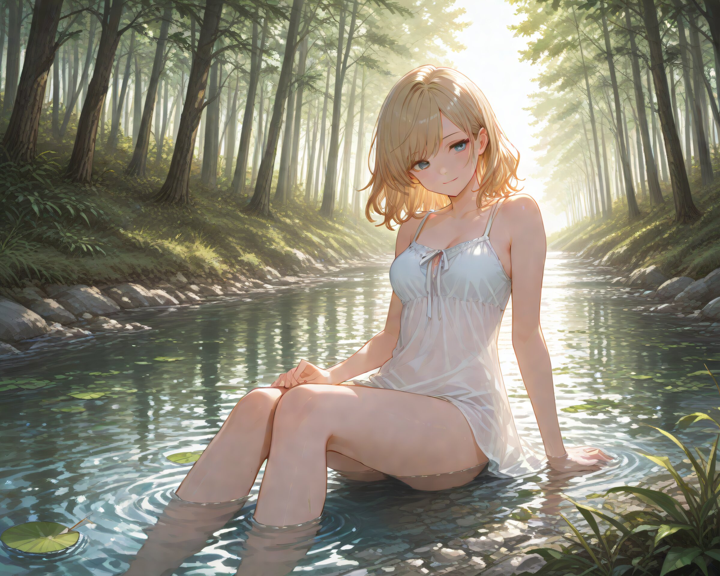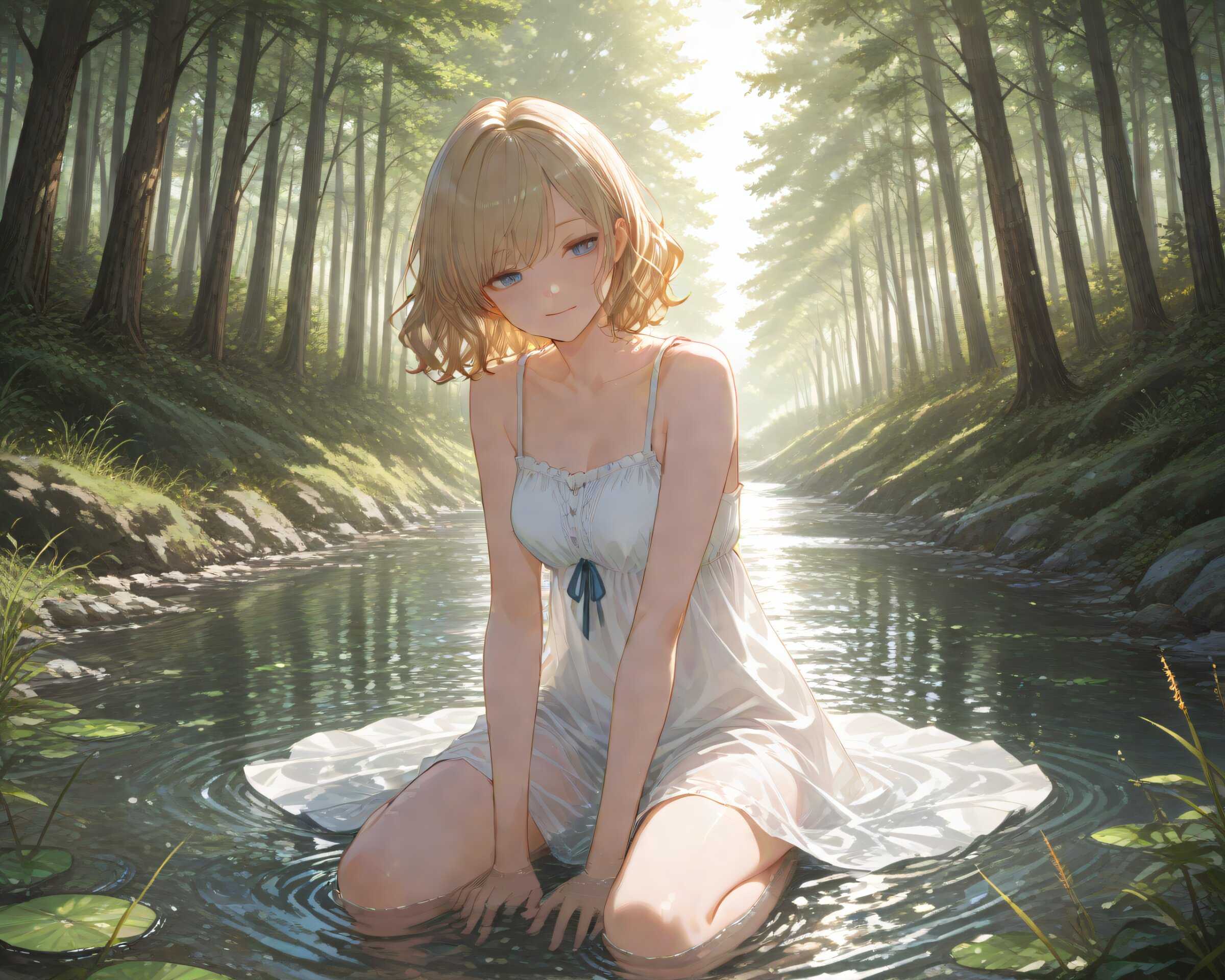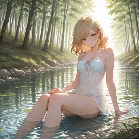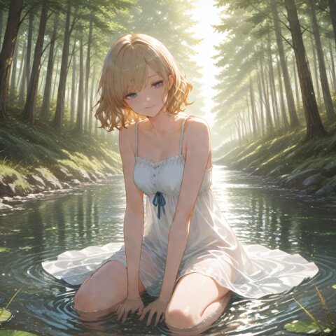 <lora:hyper_sdxl_8_step_lora_f16:1>,, 1girl, solo, a peaceful summer day, a girl sitting in a shallow river, gently playing with the flowing water, surrounded by lush green forest, sunlight filtering through leaves, serene atmosphere, soft lighting, BREAK 18 years old, girl, short hair, wavy blonde hair, swept bangs, medium breasts, slender, frosty blue eyes, smile, happy, BREAK masterpiece, amazing quality, best quality, very aesthetic, ultra-detailed, 8K,