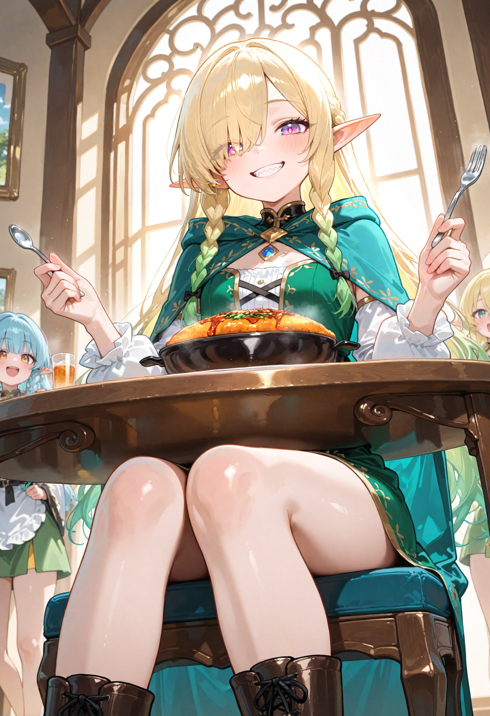 multiple girls, 4girls, (elf girls:1.2), , having a drinking party at a restaurant. (The restaurant's enchanting garden,with its lush greenery and soft lighting,provided a tranquil escape from the city's hustle and bustle:1.2).. They are seated around a round table, drinking, chatting, and enjoying their food. Please show their joyous expressions and the sense of camaraderie between them, (noon:1.3), soft natural sunlight, ((close to viewer:1.2), knees out of frame:1.1), , from below, (fisheye lens angle:1.0), , perfect anatomy, with fork ,spoon, , eating chicken teriyaki on plate, gratin on pan, , sliced bread brown stew, professional anime art lots of details, , overexposure, shiny-glistening, (watercolor style:0.8), (pastel color style:1.0) you can add scenery, (volumetric lighting), To make the background more distinctive. super fine concept art, hard surface, 8K, unreal engine, masterpiece, best quality, amazing quality, very aesthetic, absurdres, <lora:noline (1):-0.5> <lora:sdxl2-flat2-512b:0.0> <lora:facelightup_xl_v10:0.5> 文字数制限により省略