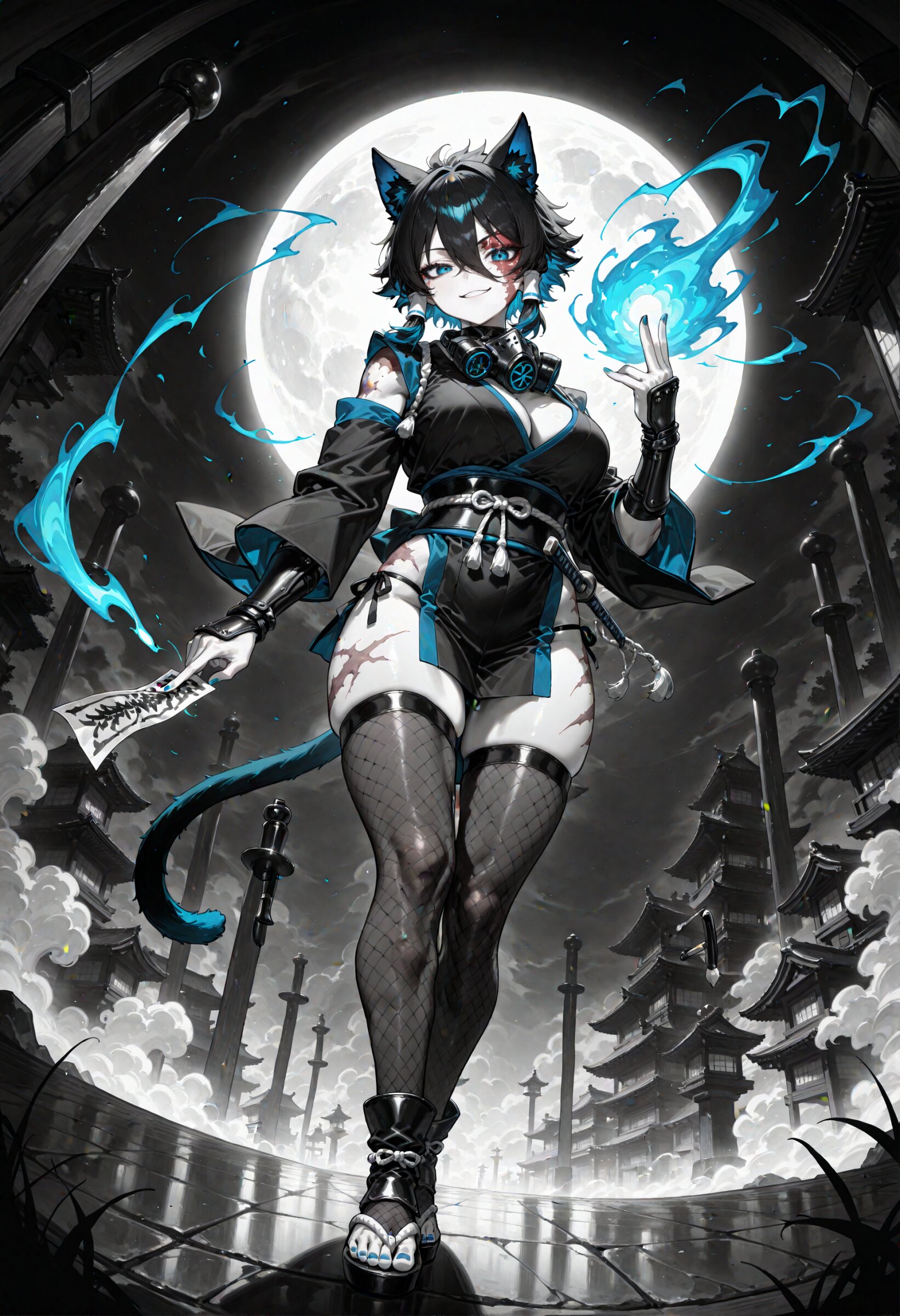 (fisheye,fisheye lens angle:1.0), from below, looking down looking at viewer, (dutch angle:1.2), Deep within a Western fantasy world, a mirror dungeon with walls lined with countless mirrors creates a labyrinth of infinite reflections. Its entrance is an arch with intricate silver carvings, resembling a gateway to another world. Inside, the complex dance of light and shadow blurs the line between reality and illusion. At the center, a large circular mirror acts as a portal to a place beyond time and space. The dungeon serves as a trial ground for confronting one's inner self, attracting magicians and adventurers in search of truth., sumi-e, faux traditional media, color ink \(medium\), painting \(medium\), calligraphy brush (medium), monochrome, spot color, 1girl, samurai, (muscular female:0.65), multicolored hair, dark green,beige,copper hair, short hair, spiked hair,long bangs , hair tubes, tsurime, beautiful blue eyes large breasts, scar on face, scar on stomach, burn scar, ninja cloth, short kimono, obijime, fishnet inner, fishnets, fishnet thighhighs, pelvic curtain, panty straps, kote, (ninjutsu:1.1), (floating many shurikens:1.1) mask around neck, respirator, , cleavage, zouri, cat ears, cat tail, ,, japanese clothes, seductive smile, dynamic pose, kung fu attack, kung fu action, kuji-in, ninjutsu, reverse grip, raijin, lightning ink wash painting, , swirling energy,energy magic, holding magic ofuda, super fine concept art, hard surface, 8K, unreal engine, masterpiece, best quality, amazing quality, very aesthetic, absurdres, you can add scenery, (volumetric lighting), To make the background more distinctive. professional art lots of details, , overexposure, sumie effect style, <lora:noline (1):-0.5> <lora:sdxl2-flat2-512b:-1.0> <lora:facelightup_xl_v10:0.5>