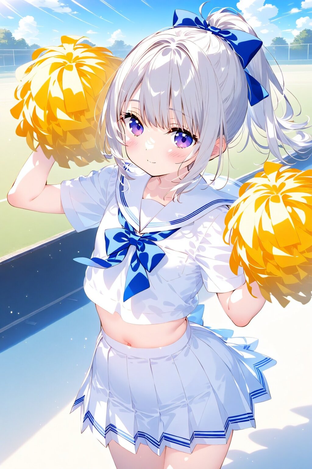 very cute female child, 10yo, blush, light smile, purple eyes, ponytail, silver hair, flat chest, (white serafuku:1.3), (sailor collar and blue bow:1.1), cheerleader, rah-rah skirt, day, summer, blue sky, white cloud, school yard, diagonal view, from above, cowboy shot, solo, 1girl, BREAK (masterpiece, best quality, ultra-detailed), perfect hand, <lora:flat2:-0.2>