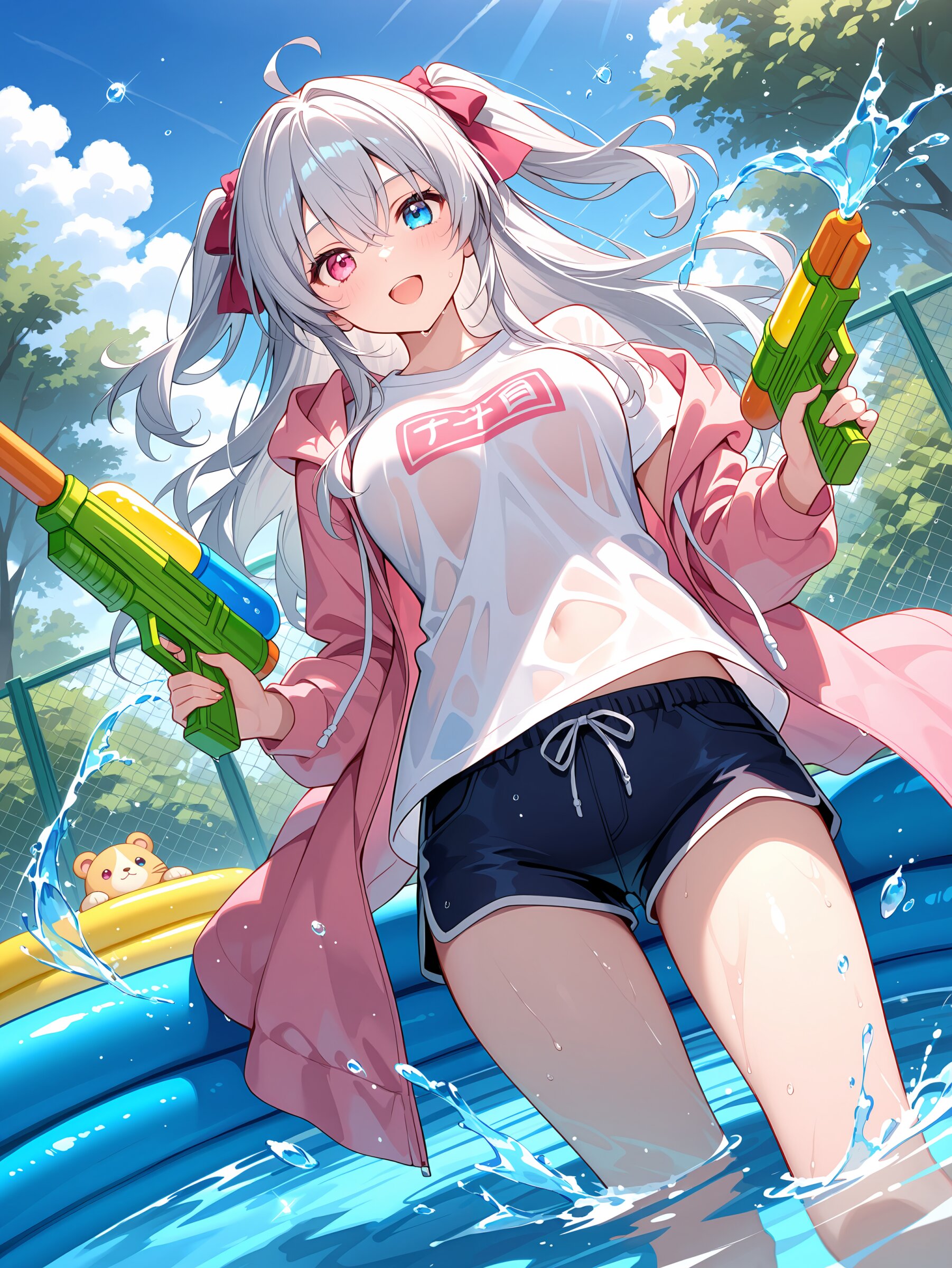 hoodie,T-shirt,short pants, garden, wading pool holding water gun, splashing, wet lense, dynamic angle, cinematic scene,