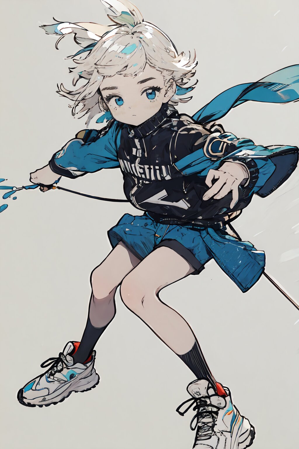 absurdres,detailed and intricate, (best quality), BREAK,(solo),(1girl),super beautiful,full body, BREAK,(white hair),extra short hair, BREAK,blue-eyes, BREAK,unique fashion,sneakers,socks, BREAK,(dynamic Angle,dynamic pose),