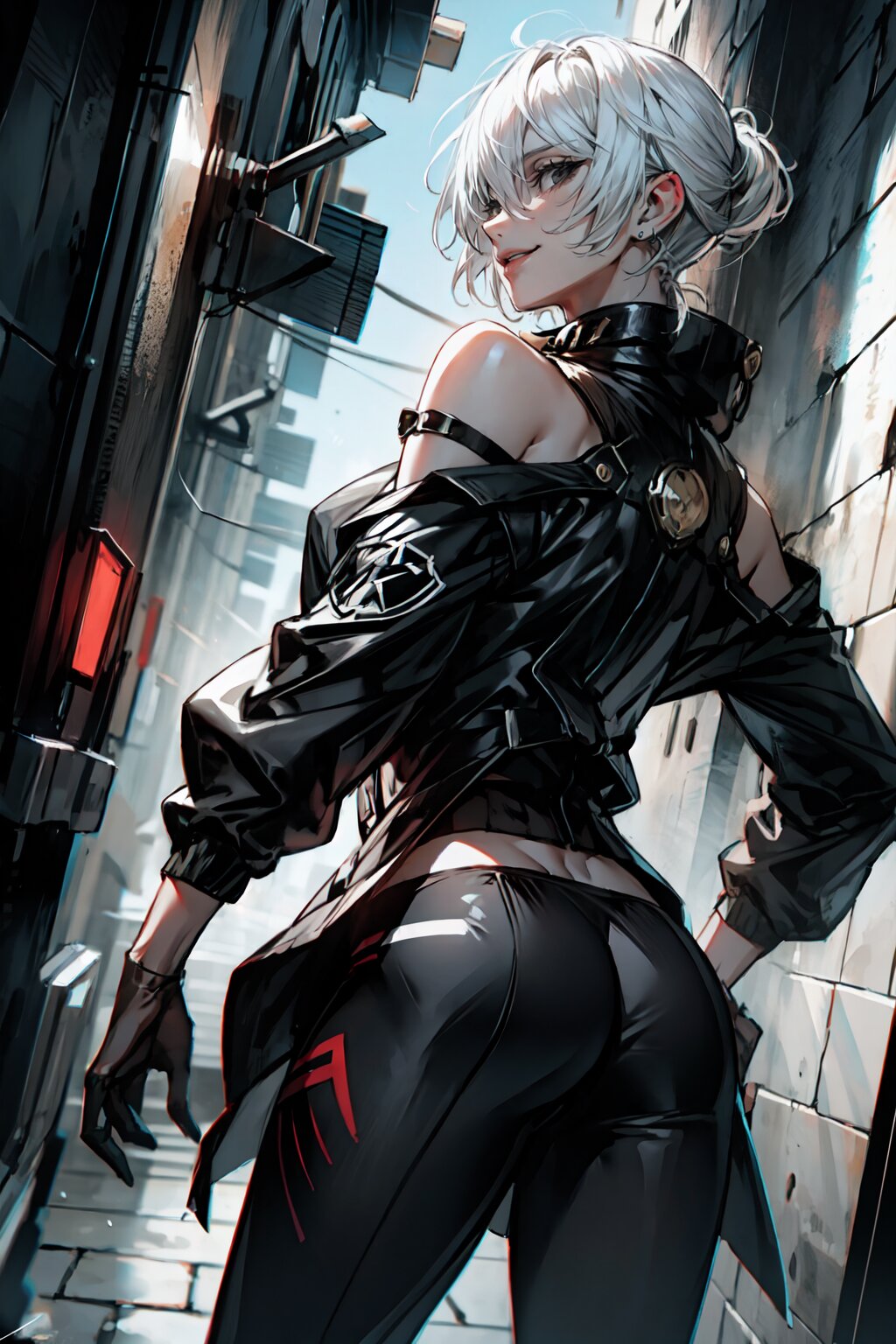 absurdres,detailed and intricate, (best quality), BREAK,solo,(1male,1boy),cowboy shot,outlaw,viran,(giggling),beautiful, BREAK,(white hair), BREAK,black eyes,eyebrows,sanpakugan,bags under eyes,sharp nose,facial muscle, BREAK,(bare shoulders Jacket:1.3),oversize Jacket,TECHware,pants, BREAK,night,cyberpunk city,cyberpunk,alleyway,back alley,outdoor,(dynamic Angle,dynamic pose:1.3),