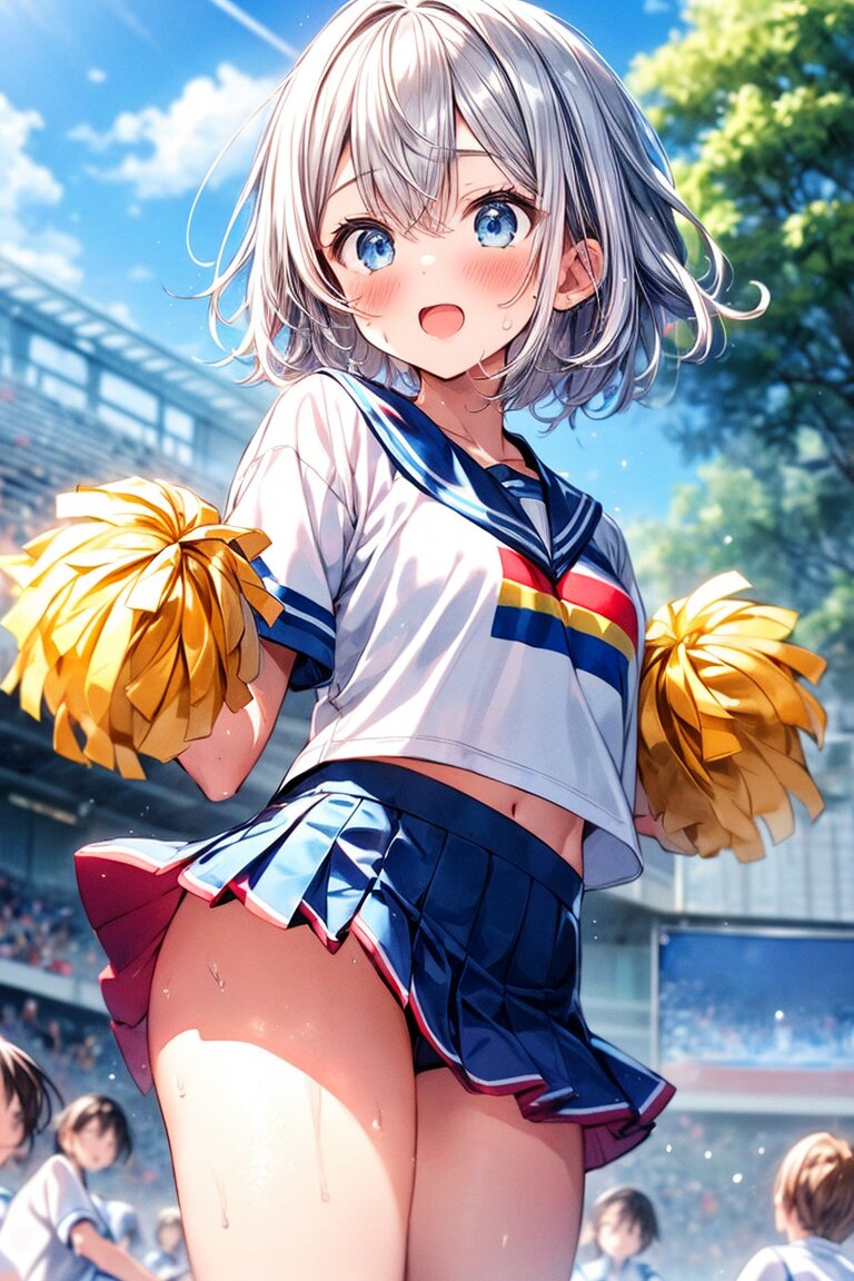 girl,young,cute,Elementary school student,shorthair,mini skirt,short sleeve,silver hair,blue eyes,cheerleader,watercolor,fantasy,day,summer,Sports day,support,Sweat <lora:flat2:-0.9> <lora:deluster2:-0.5>