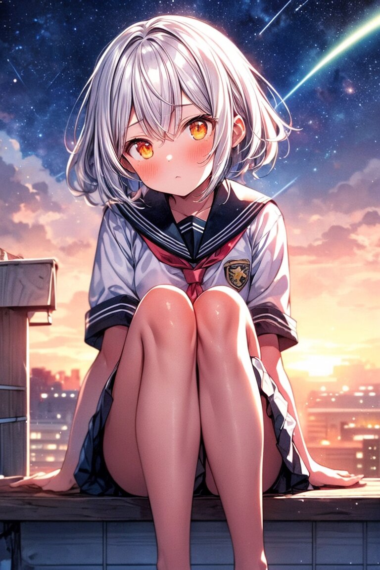girl,shorthair,mini skirt,silver hair,orange eyes,female knight,colorful,watercolor,different world,sitting ,Thigh emphasis, ,summer,lirax, ,ojou-sama,starry sky,sunset,school,school rooftop, troubled face, <lora:deluster2:-0.7> <lora:flat2:-0.9>