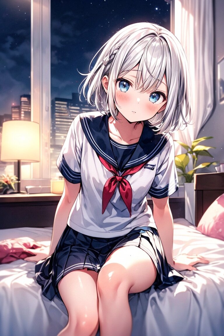 girl,young,cute,Elementary student,shorthair,mini skirt,silver hair,blue eyes,watercolor, ,colorful, ,date,looking at the,Thigh emphasis,troubled face perspective, Panchira ,short sleeve,summer, top , ,bedroom,night,sitting <lora:flat2:-0.9> <lora:deluster2:-0.5>