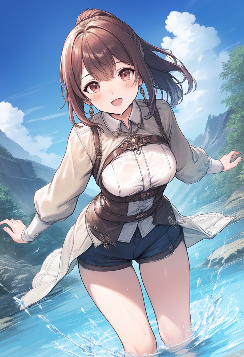 (traditional media:1.5),(sepia:1.8),masterpiece,best quality,ultra detailed,lake,dutch angle,, rating:general, best quality, very aesthetic, absurdres,Girl,standard height,medium_breasts,brown hair,{{{ponytail}}},swept bangs,Beautiful face,brown eyes,faint lips,Beautiful face,chestnut brown eyes,tareme,earrings,battle costume,short shorts,open mouth,bent over,happy,Water Play,splashing water on, entering a lake,My clothes are wet, my body is wet,earrings,Splash