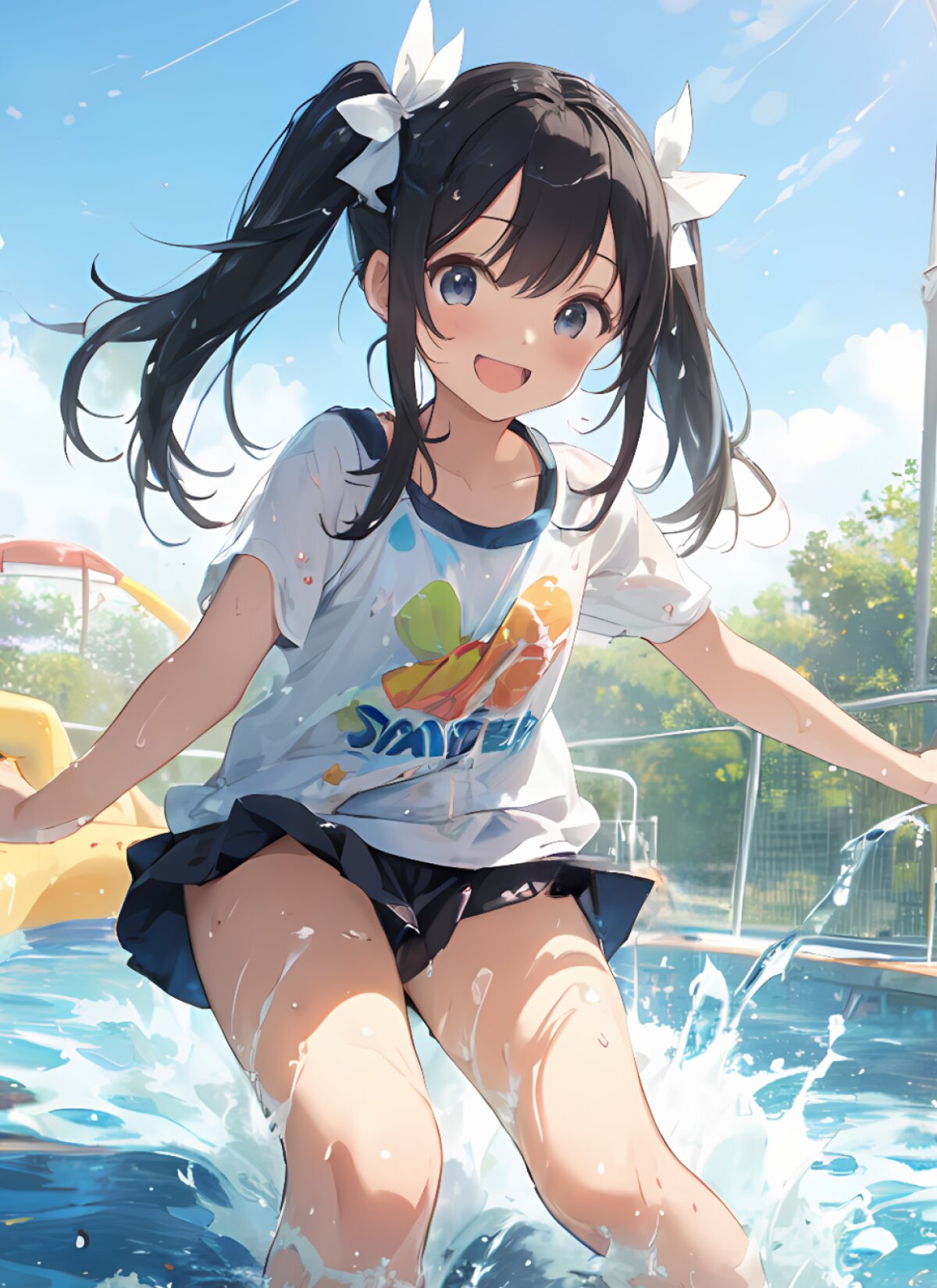 masterpiece, best quality, 1girl,water park slide,splashing,pareo,sliding,having fun,twintail,blue sky,