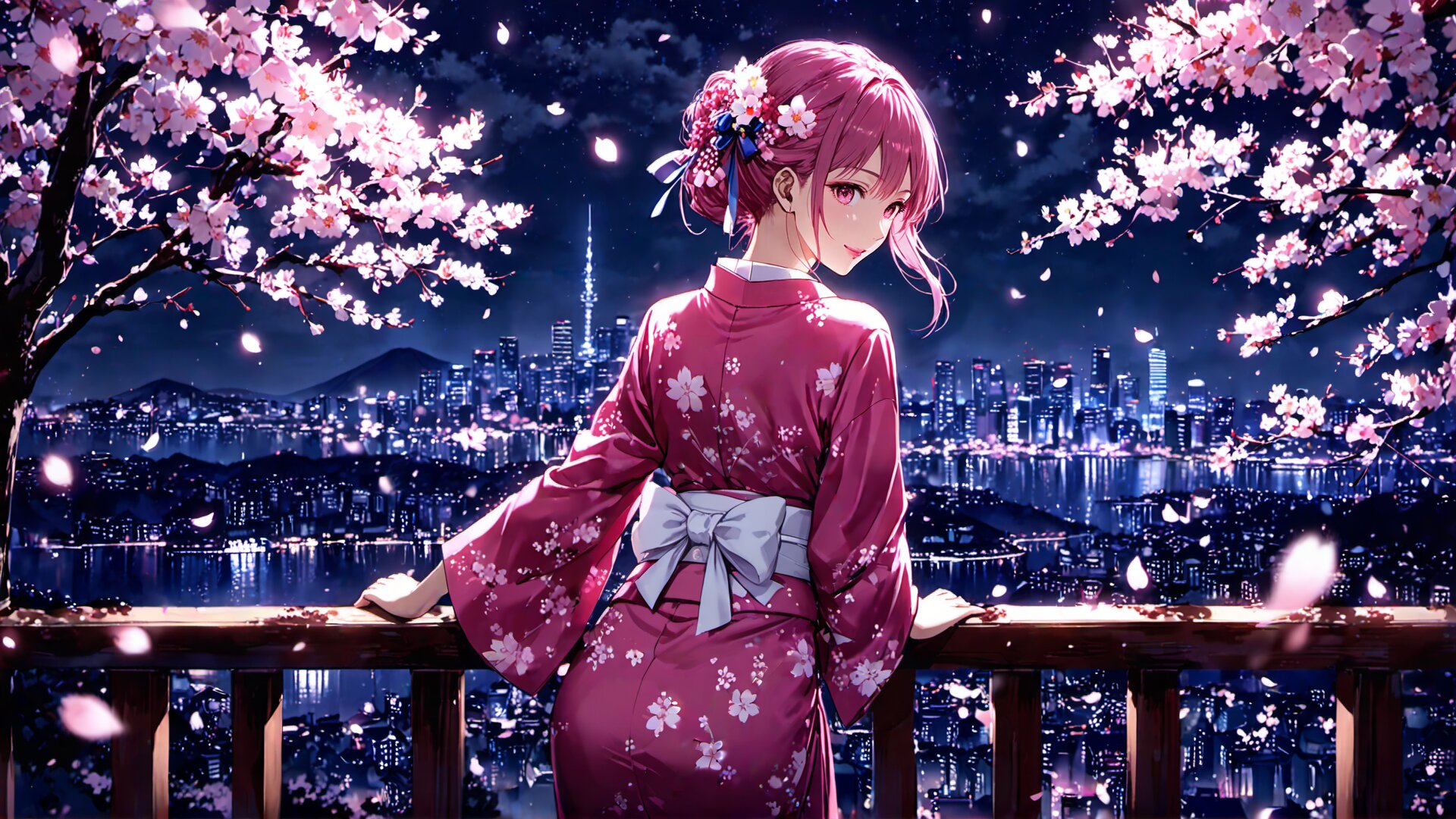 (masterpiece:1.1),ultra-detailed,beautiful detailed eyes,unity 8k wallpaper,(Japanese Anime:1.1),no text,high contrast,SIGMA 50 mm, break vintage film effect, break sakura,(a flurry of cherry blossom petals:1.1),(japanese spring festival:1.5),(soft lighting,moonlight:1.1),(Cherry Blossoms at Night:1.5), break (A digital painting of a distant city skyline at night:1.8),(famous nature park,shrine), break (A stunning Japanese woman in her late 30s, wearing a silk pink Yukata patterned with White Sakura cherry blossoms:1.5),(1woman,solo:1.8),(large ribbon obi in deep rose pink tied at her lower back:1.8),(standing on a stone bridge under moonlit cherry blossoms and glowing square paper lantern stone pathway at night:1.1),(serene downcast gaze, realistic anime portrait, soft cinematic lighting:1.1),correct clothing orientation, break (posing with an over-the-shoulder glance, looking back at the camera, soft smile, elegant posture),(Leaning on a wooden railing:1.1), break (slender body:1.8),(Bright expression:1.1),Smile,small mouth with soft pink lipstick,defined cheekbones,calm,sleek hairstyle,medium breasts,(nice hands,perfect hands:1),<lora:neg4all_bdsqlsz_xl_V91:1>,
