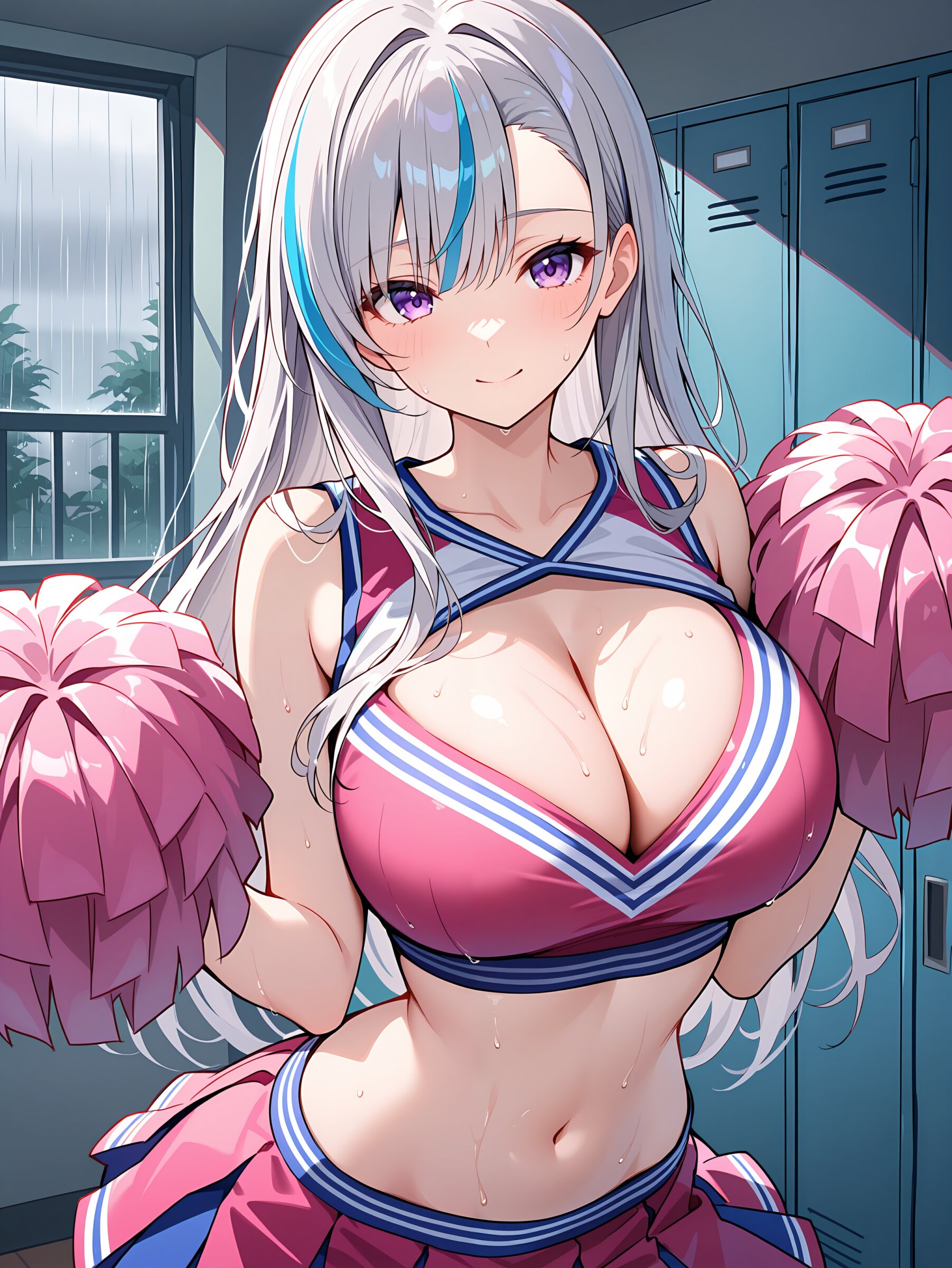 cheerleader,holding pom pom \(cheerleading\), breasts squeezed together, in room,locker room, rain, window,