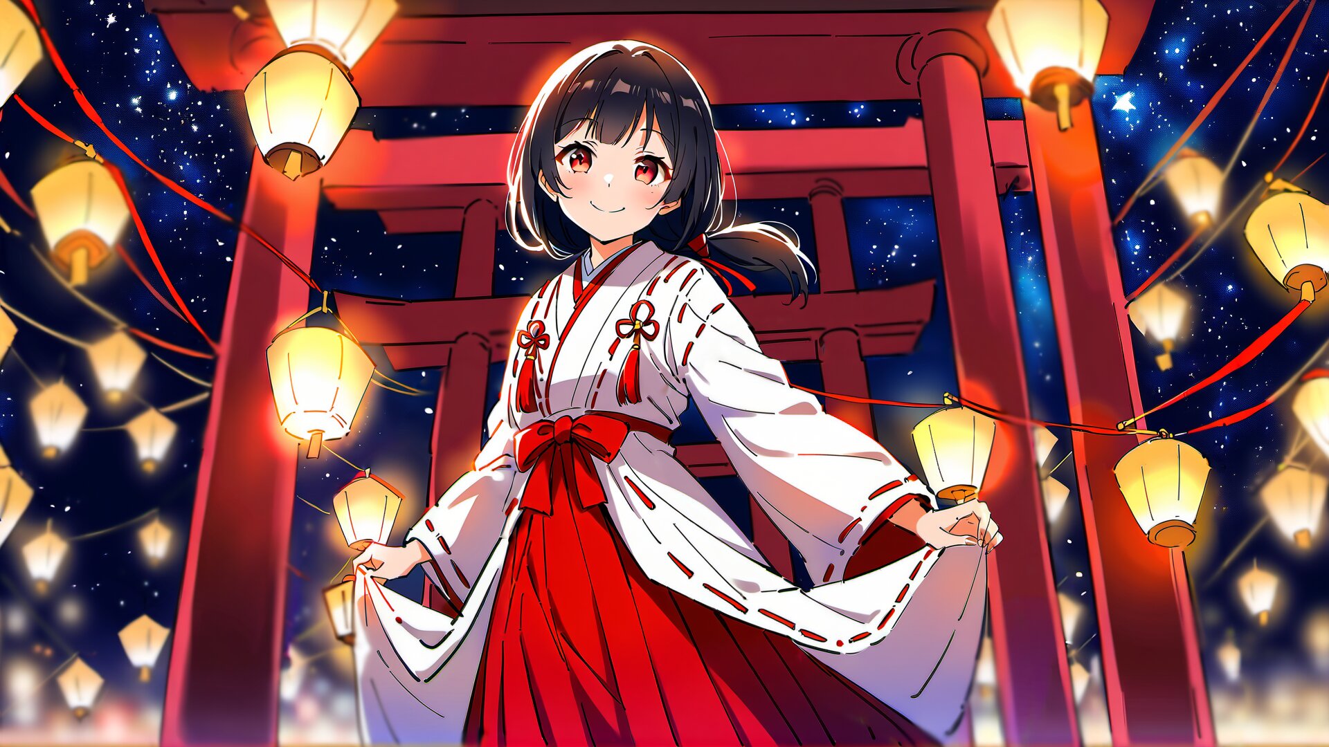 Midjourney,(best quality),(masterpiece),(highres),original,extremely detailed 8K wallpaper,(an extremely delicate and beautiful),(Unreal Engine:1.1),(hyper quality:1.1),realistic shaded,break Front Light,Diffused Light,(Glow:1.9),(high brightness:1.5),(Sparkling atmosphere:1.5),(Warm atmosphere:2),(wide starry sky:1.1),(night sky:2),(japanese festival:2),(A lantern with red tassels:1.1),(Shrine grounds:1.6),(SIGMA 14 mm F/1.4:2),ADDCOMM, Lantern,ADDCOL, break (torii:2),(shrine:1.1),break Back Light,Rim Light,front facing,(1girl:2),(10 years old:2),child,Looks fun,(knee shot:1.8),(japanese white clothes,red hakama:2),break,black hair,(kawaii miko girl with low ponytail black hair and glowing skin and perfect symmetrical face with blush cheeks:1.2),(wearing japanese white clothes:1.1),(shrine maiden outfit:1.1),(red skirt:1.1),(Grab the skirt:1.1),(Smile:2),(black hair),(Good hand:1.1),(Good face:1.1),ADDCOL, break Lantern Wall,