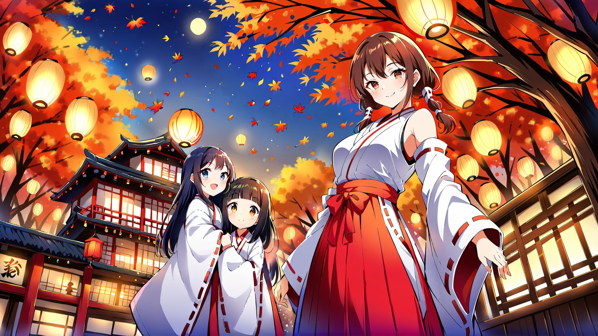 <lora:DetailedEyes_V3:0.2>,(ultra-detailed:1),(best quality),(masterpiece),(highres),original,extremely detailed 8K wallpaper,(an extremely delicate and beautiful),(Bright moonlit night:1.2),(SIGMA 14 mm F/1.4:2), (((2girls))),(Autumn festival:2),(autumn leaves:1.2),(Forest:1.2),(Mountain village:1),(Old Japanese house:1.2),ADDCOMM, break,(1girl:3),(10 years old:2),(miko:2),(japanese white clothes,red hakama:2),break,kawaii miko girl with low ponytail black hair and glowing skin and perfect symmetrical face with blush cheeks,(wearing japanese white clothes:1.1),(shrine maiden outfit:1.1),(red skirt:1.1),(Smile:2),(black hair),(Good hand:1.1),(Good face:1.1),ADDCOL, ADDCOL, 1girl,ascot,bow,brown eyes,brown hair,detached sleeves,frills,hair bow,hair tubes,hakurei_reimu,jewelry,licking lips,looking at viewer,on back,red bow,ribbon trim,shirt,skirt,socks,solo,upper body,yellow ascot,(Good hand:1.1),(Good face:1.1),(Smile:2),(miko:2),(japanese white clothes,red hakama:2),(shrine maiden outfit:1.1),(red skirt:1.1),