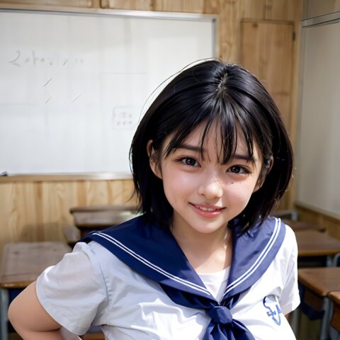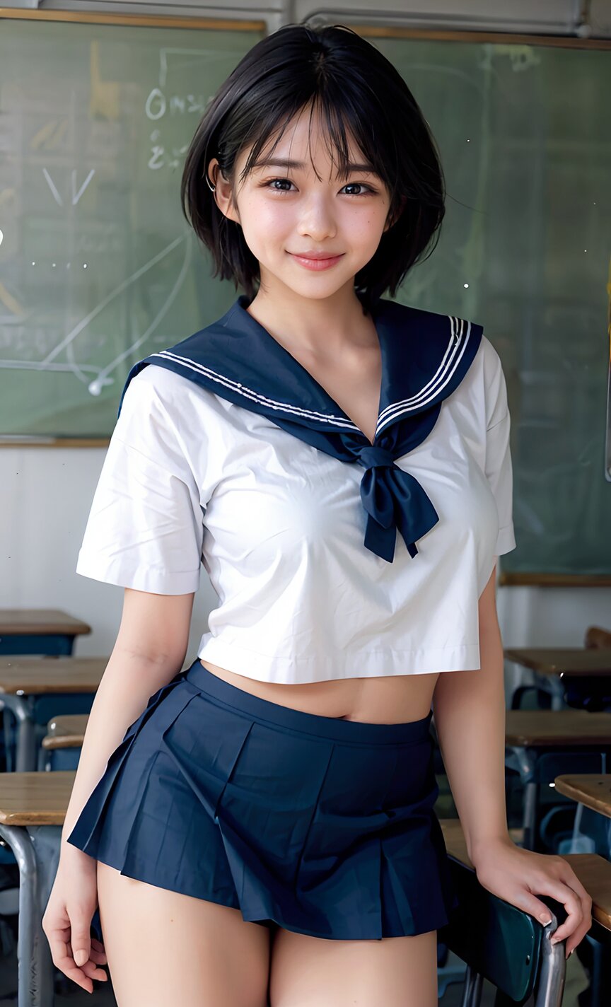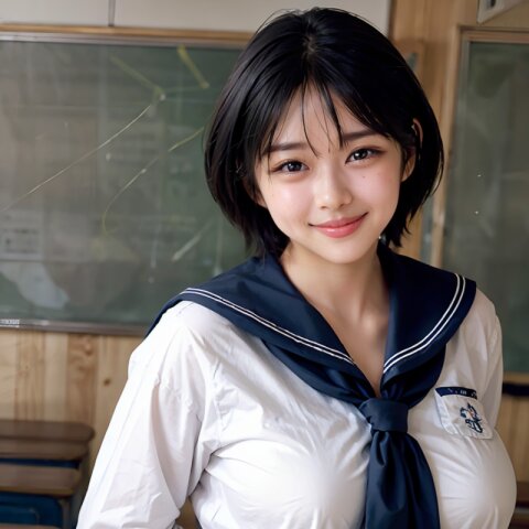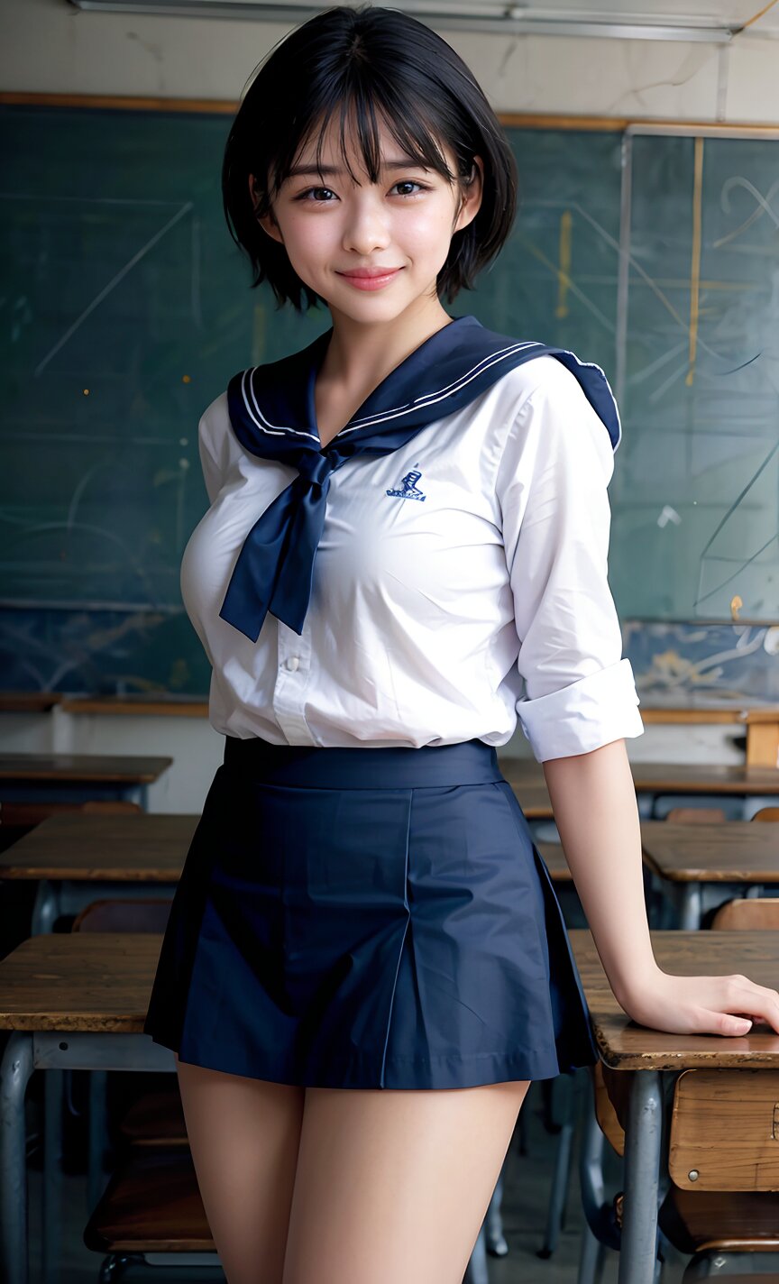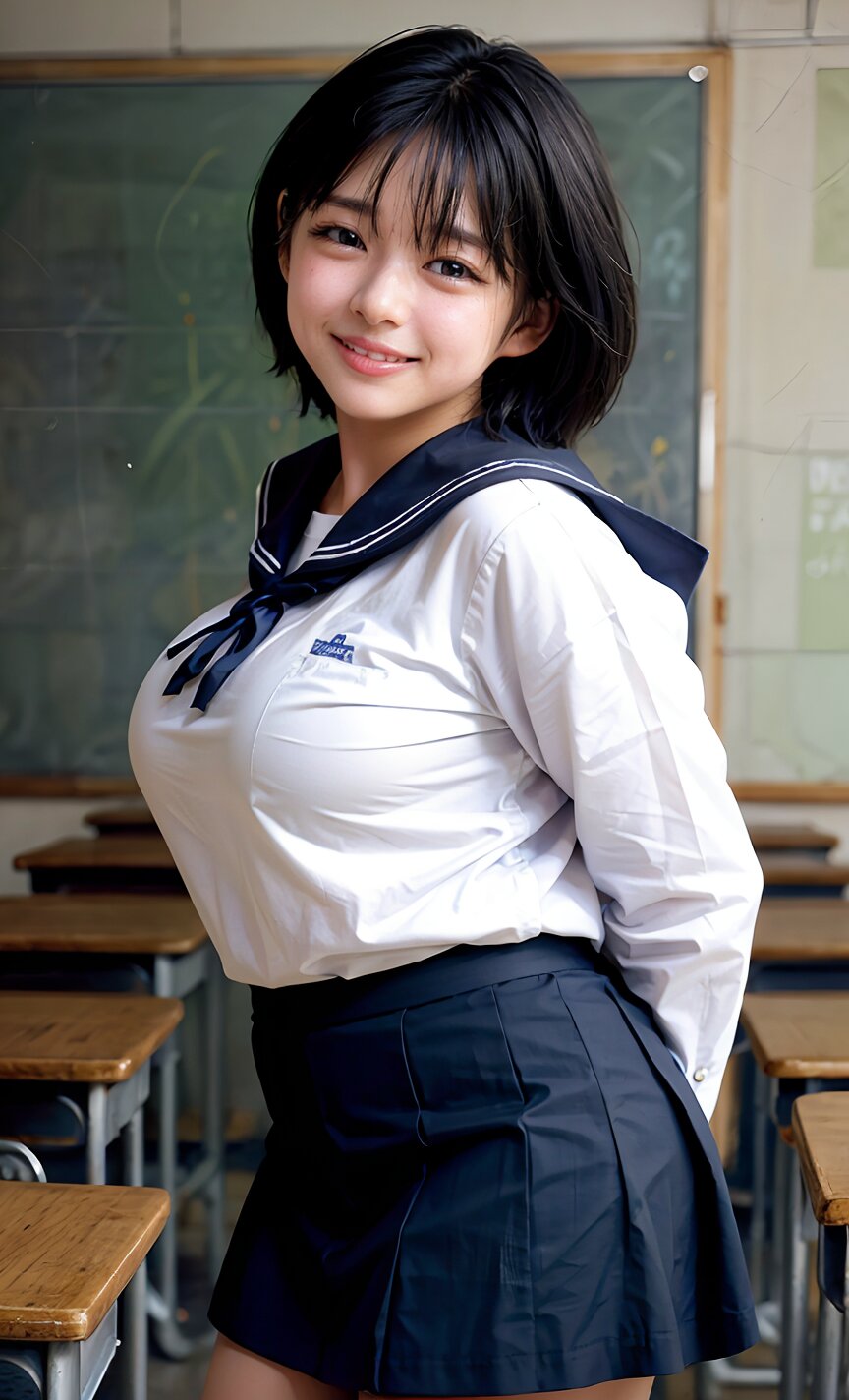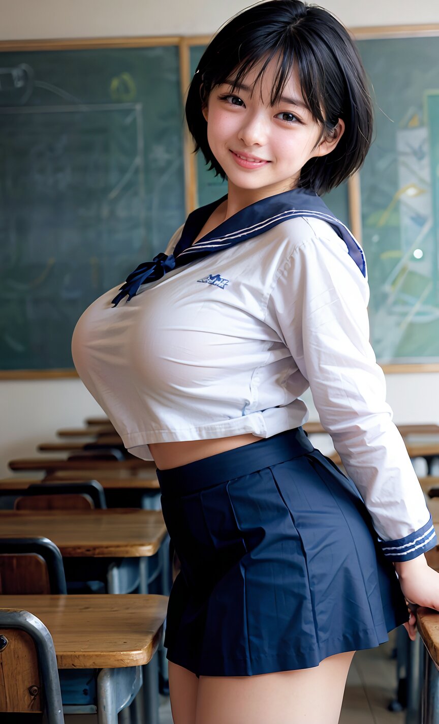 (cowboy shot, random angle: 1.6), (8k, best quality, masterpiece:1.4), (realistic, photo-realistic:1.6), HDR, (incredibly absurdres:1.2), (vibrant color:1.2), ultra-detailed, 1girl, 16 years old, (school uniform, sailor suit, mini skirt: 1.6), short hair, (chubby: 1.2), (perfect anatomy, huge breasts: 1.4), beautiful detailed face, perfect skin, detailed skin texture, looking at viewer, (standing: 1.2), in the classroom, <lora:umi_v01:1>
