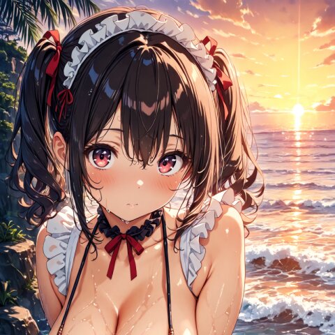 masterpiece, best quality, bikini, frills, outdoors, wet,