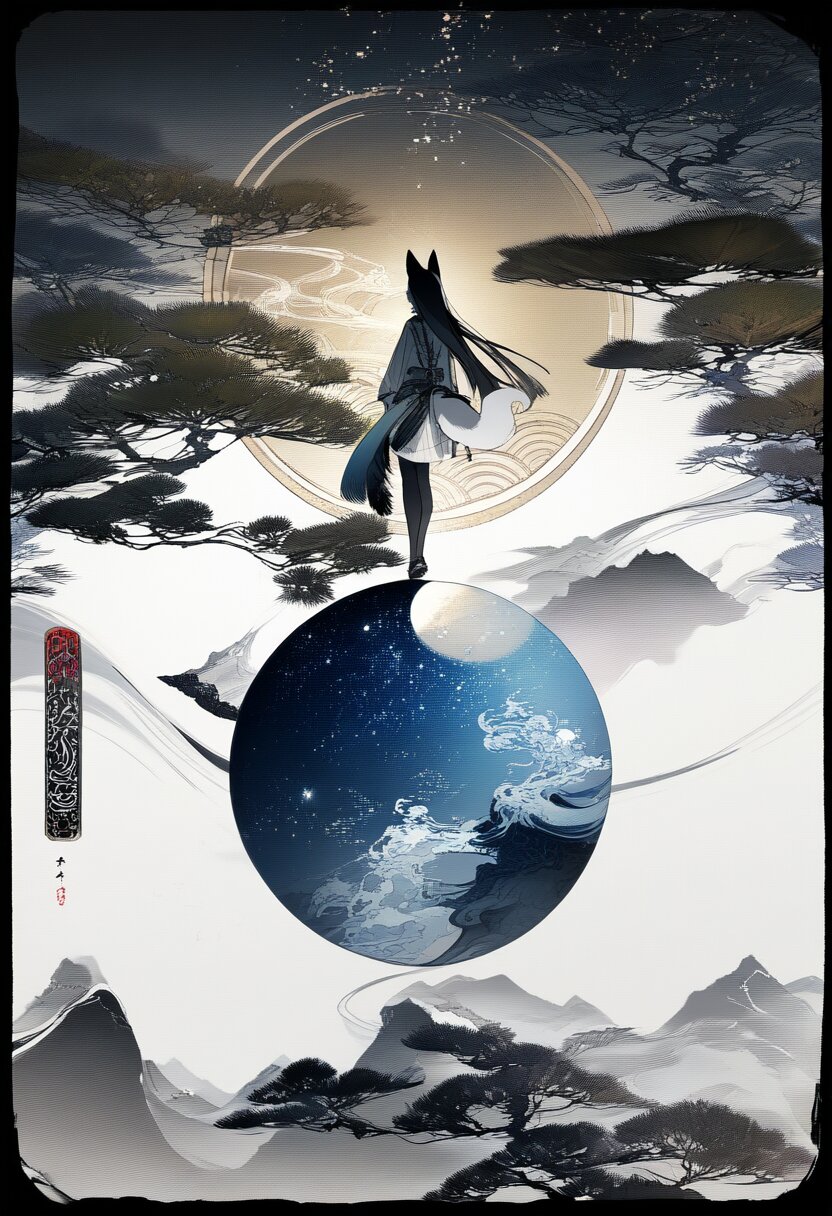 すっごいガチャですけど、浮世絵、墨絵、スターリースカイ、山を要素に、シンプルバックグラウンドでただの風景にならないようにして(抽象的になる)、