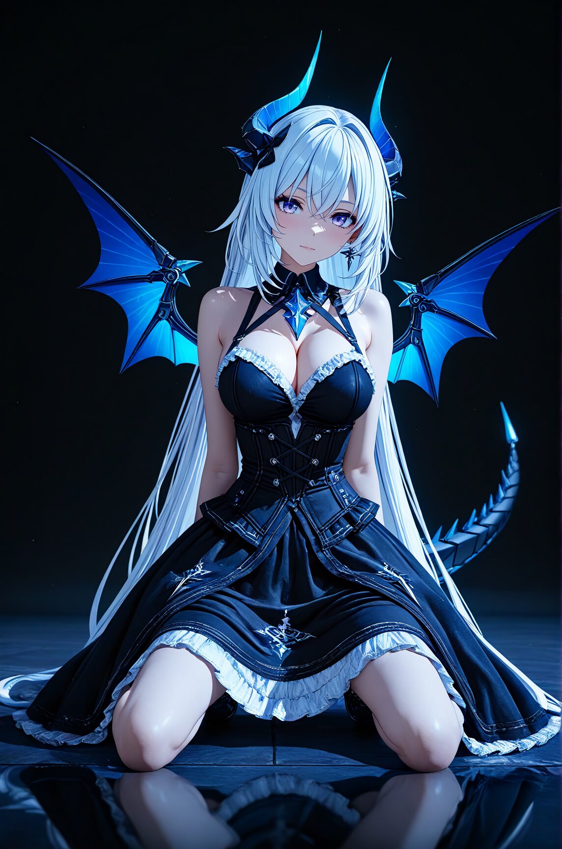 Anime illustration,CG art,3D model,3D rendering,3D skin texture with high detail,depth of field,1 person,a girl with a mix of gothic and fantasy elements kneeling on the ground,the girl is wearing a black and white frilly dress with mechanical details,she has long white hair,her arms and legs are covered in black spiky armor,she has large black dragon-like wings and a tail,a mechanical dragon girl,the girl's face is blurred,she has an element of mystery,the overall aesthetic is dark,she combines elements of gothic fashion with the features of fantasy creatures,black background,the blue-white light is reflected in her outfit and eyes,, masterpiece, best quality, newest, very awa