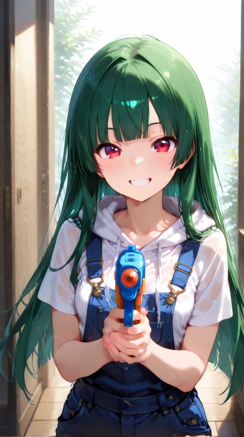 masterpiece,best quality,ultra-detailed,high resolution,super detailed skin,perfect anatomy,beautiful detailed eyes, girl, green hair, long hair, hime cut, red eyes, grin, small breasts, hoodie, short sleeve, overalls, water gun, (focus on gun in her hands)
