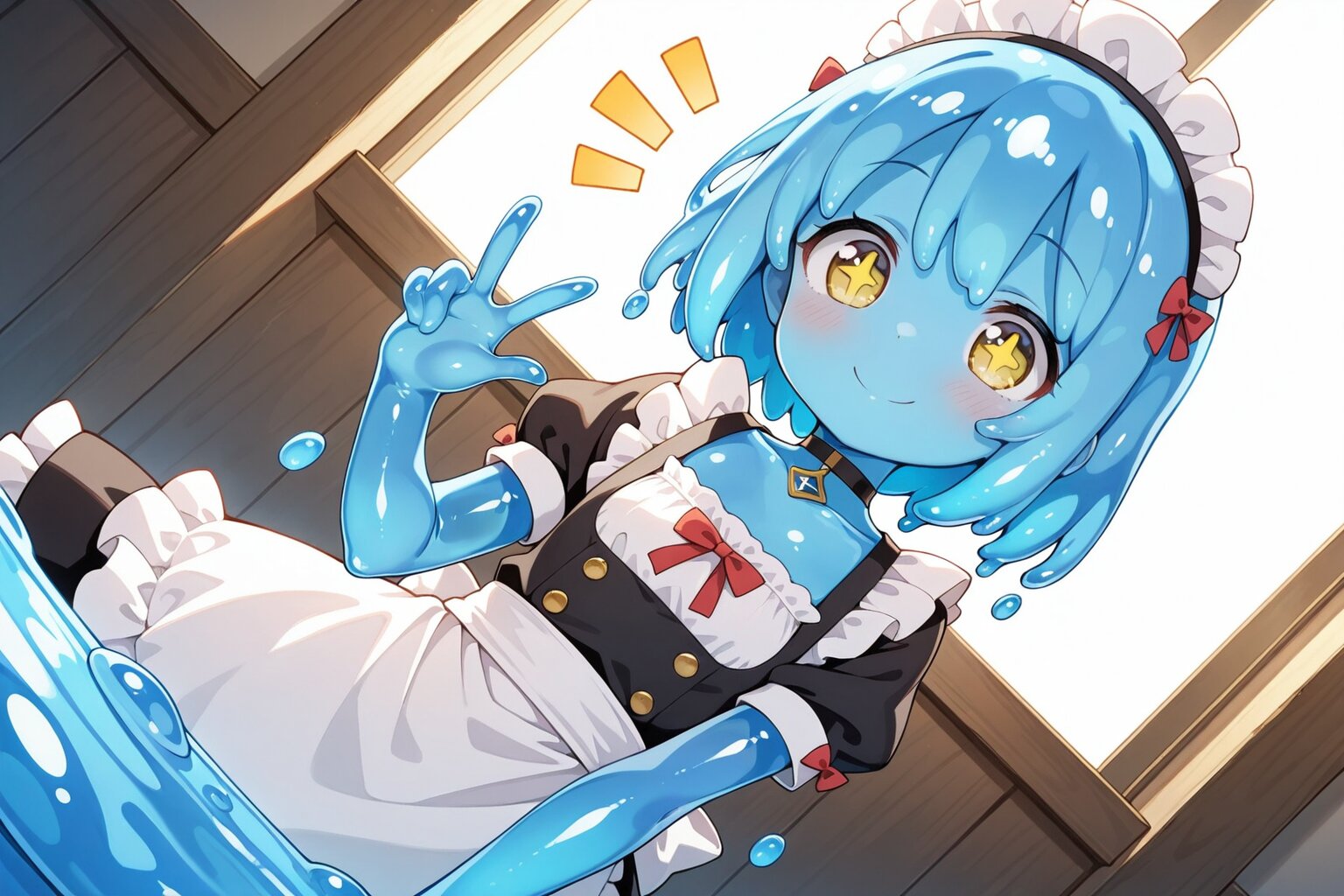 1 little girl, solo, diagonal angle, masterpiece, best quality, amazing quality, very aesthetic, blue slime girl, short hair, yellow eyes, +_+, smile, cheerful, +++, notice lines, choker, maid outfit,