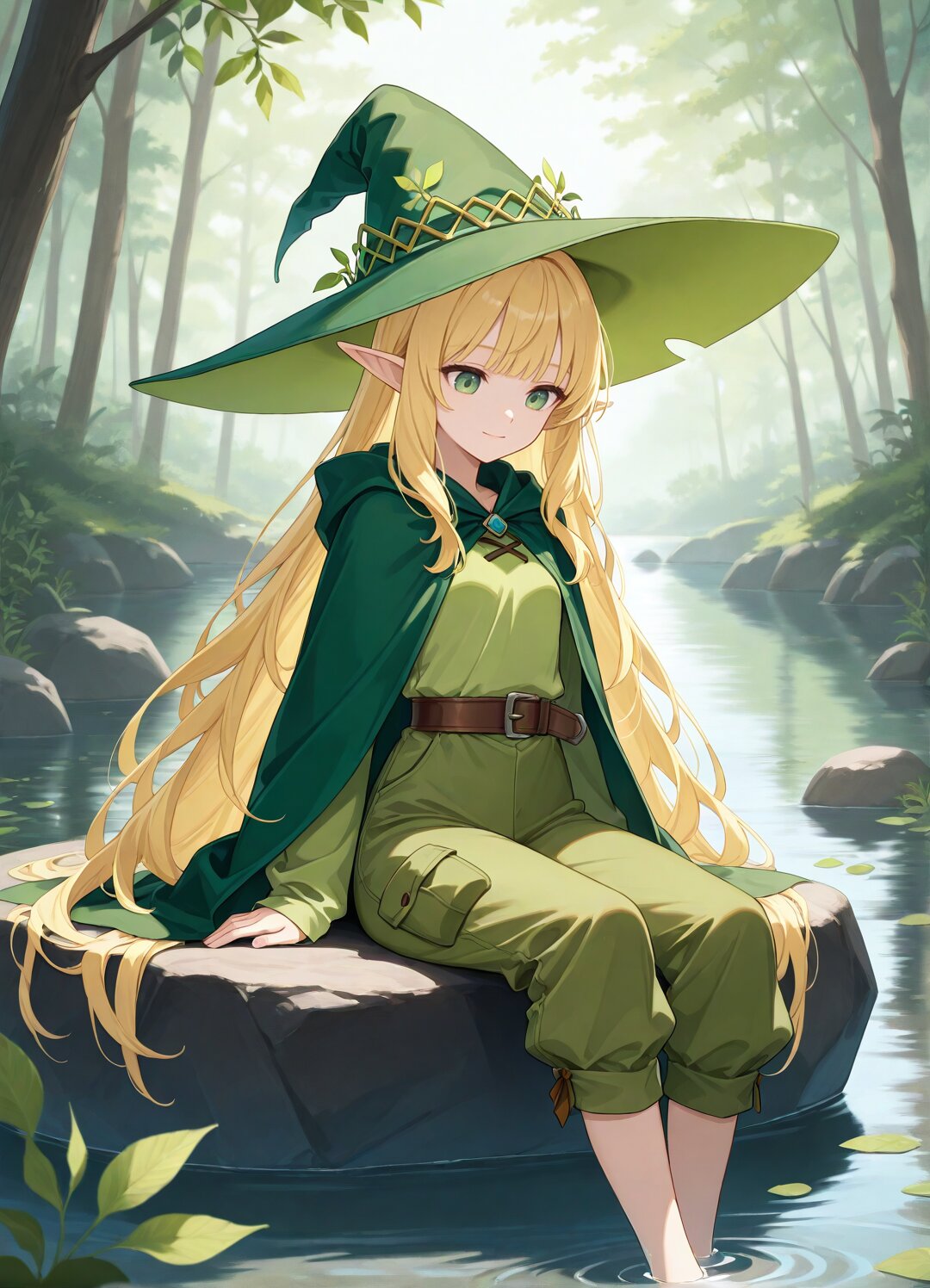 masterpiece,best quality,highres,highly detailed,detailed eyes,general,1girl,solo,17yo,(elf ears,pointy ears,(green witch hat,blond hair, very long hair,bangs, green eyes)),cute girl,slender,small breasts, long sleeves that cover wrists,light smile,closed mouth,(long green witch robe,long green witch cape, long green witch cloak, long green cargo pants),green obi,bare feet,feet in water,slender girl,cowboy shot,looking down,sitting on rock,in green forest,lake,Green leaves falling in the wind,fantasy,