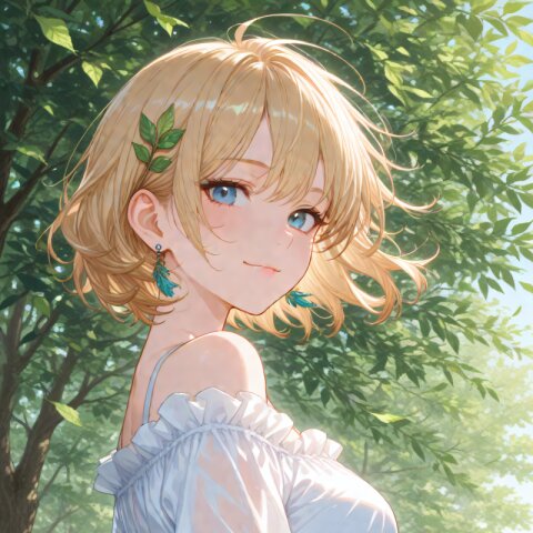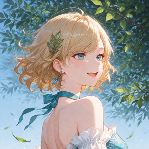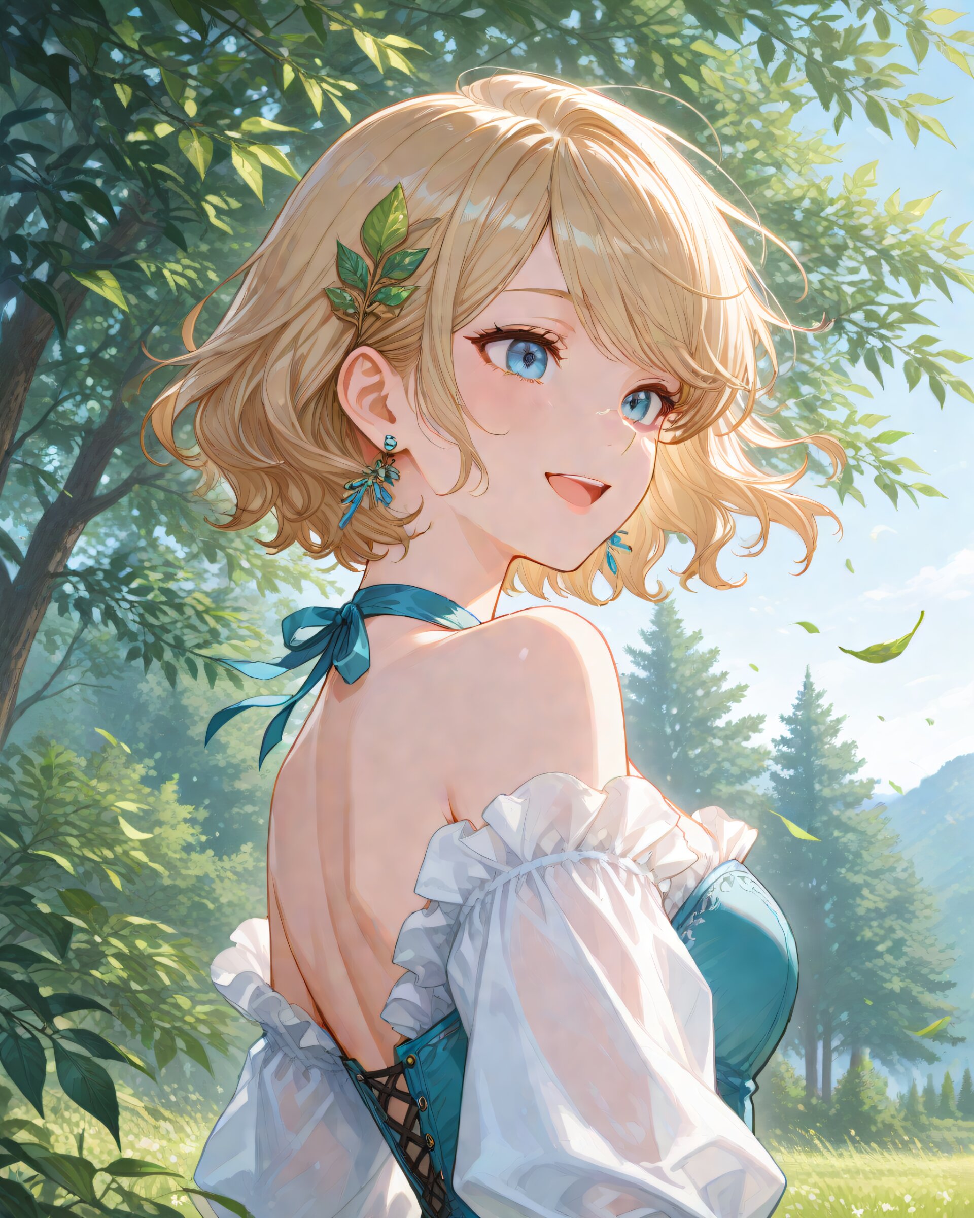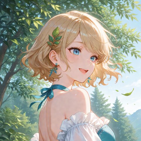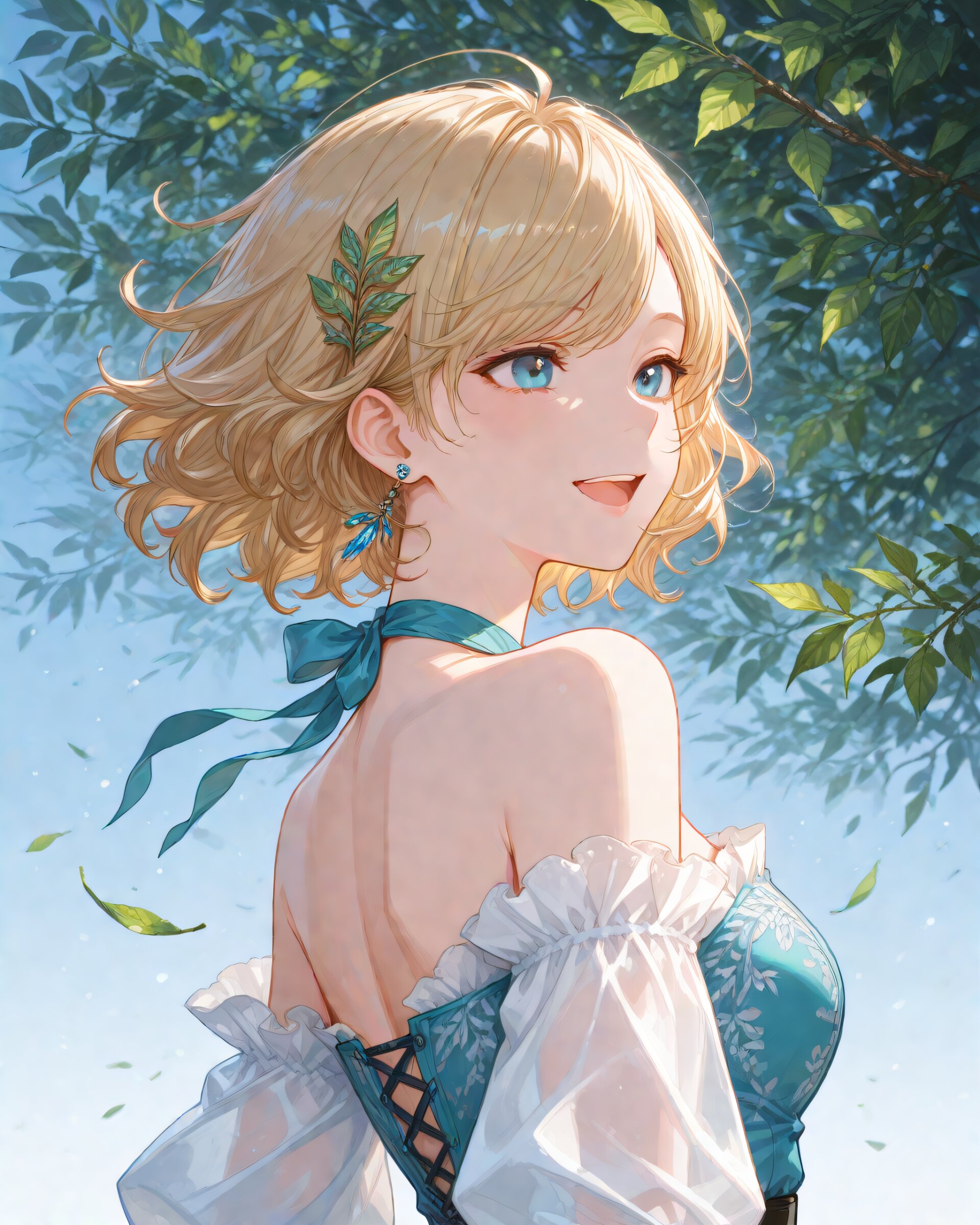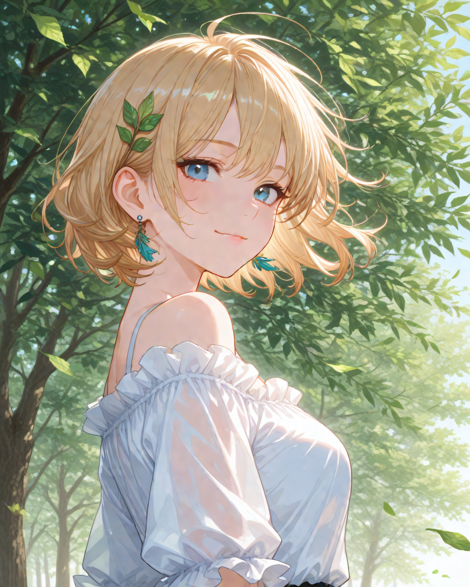<lora:hyper_sdxl_8_step_lora_f16:1>,, 1girl, many green leaf tree, wind, focus face, upper body, looking back, BREAK 18 years old, girl, short hair, wavy blonde hair, swept bangs, medium breasts, slender, frosty blue eyes, off shoulder, half sleeve, blouse, off shoulder, Halter Neck, strapless, smile, open mouth, earrings hair ornament, BREAK masterpiece, amazing quality, best quality, very aesthetic, ultra-detailed, 8K, newest, vivid,