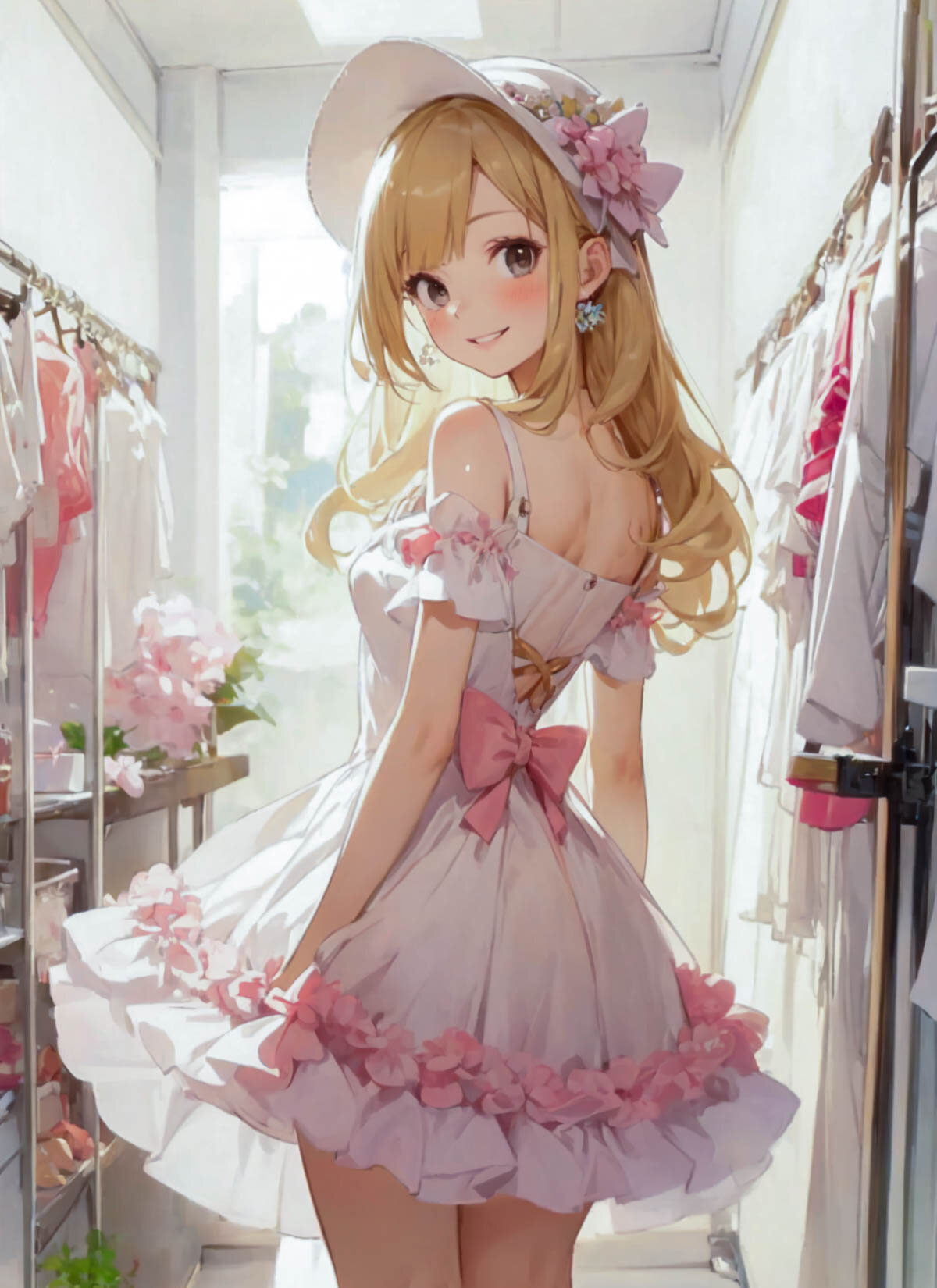 masterpiece, best quality, 1girl, spring,cordinate,date,one piece beige dress,,fitting room,dressing up,happy,smile