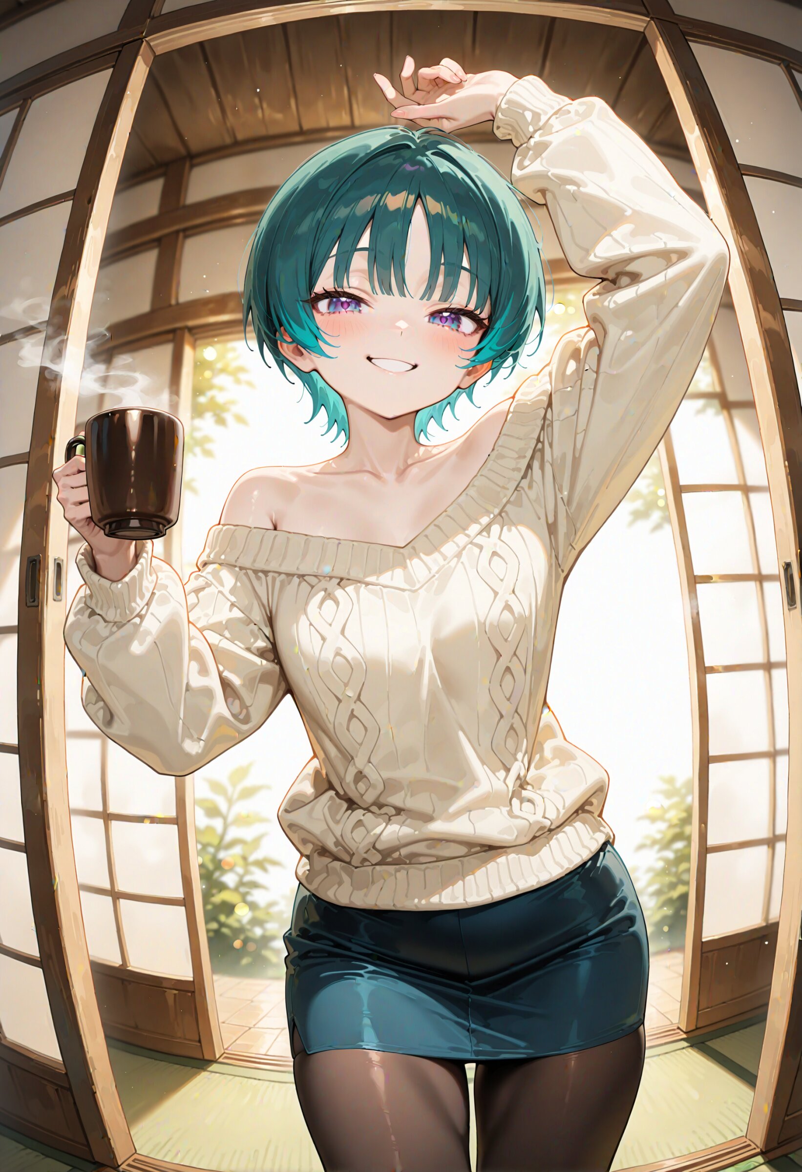 (fisheye,fisheye lens angle:1.0), (from below:1.1) looking at viewer, Line art is drawn in a warm brown tone instead of black. The outlines have a soft, earthy feel, adding a gentle and nostalgic atmosphere to the illustration. 1girl, beautiful detailed eyes, cute face, cool, light skin, skindentation, beautiful darkmagenta eyes, , , aqua hair, hazel brown colored tips cute, short hair, ,center-flap bangs , airy hair, first-rate female body perfect body beautiful small breasts, smart hips,, bare shoulders, collarbone, off shoulder, off shoulder sweater, pencil skirt, pantyhose, higheels warm comfy happy and XD, seductive smile depth of field, bokeh, shouji, sliding doors, tatami sunshine, direct lighting, holding cup of coffee spring morning sunlight, morning, sunshine, dappled sunlight, arms up, fleeing morning masterpiece, best quality, amazing quality, very aesthetic, absurdres, you can add scenery, (volumetric lighting), To make the background more distinctive. professional art lots of details, , overexposure, shiny-glistening, (watercolor style:1.0), (pastel color style:0.0) <lora:noline (1):-0.5> <lora:sdxl2-flat2-512b:0.15> <lora:facelightup_xl_v10:0.5>