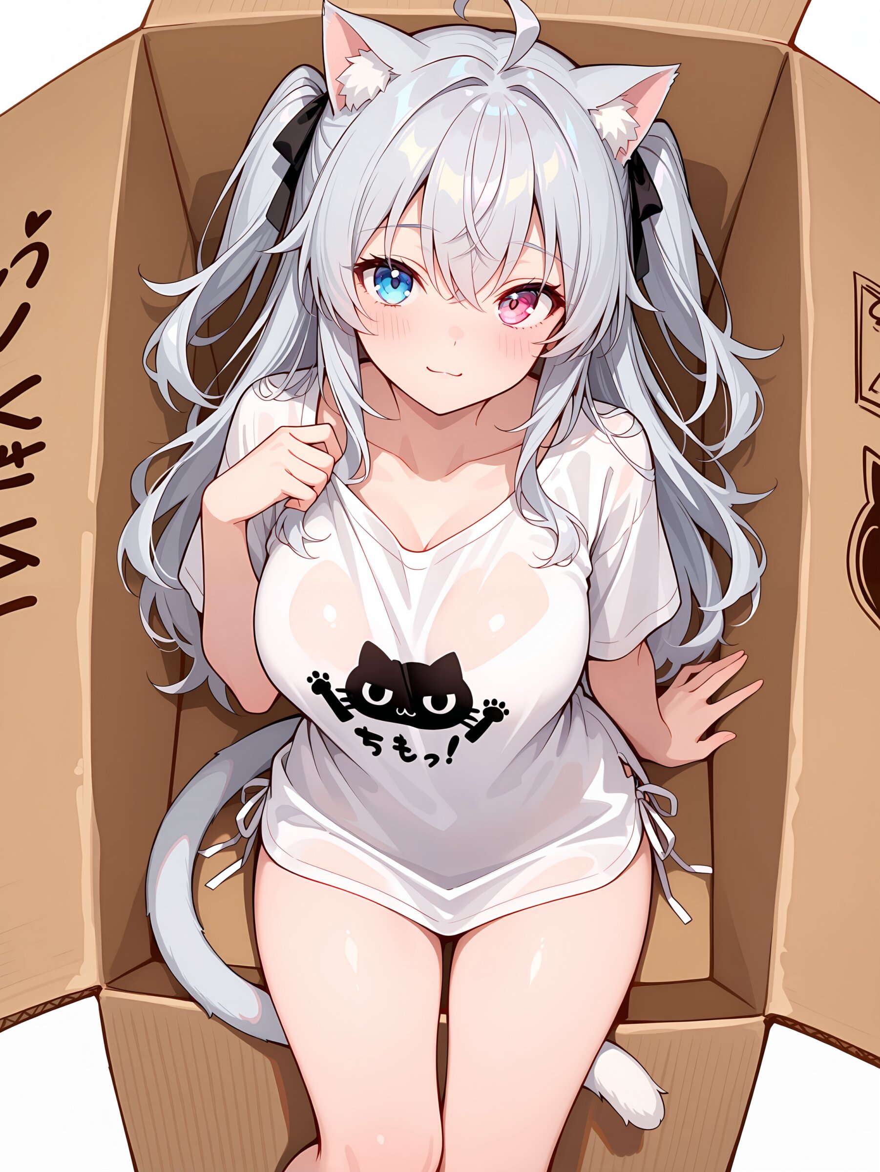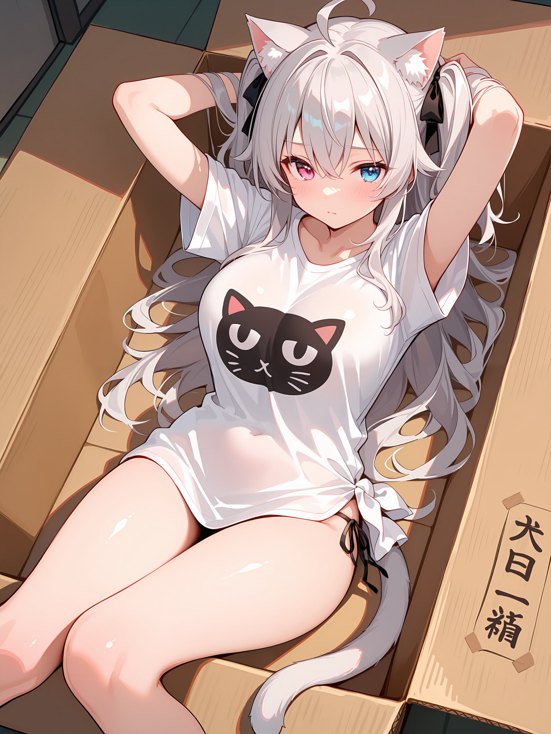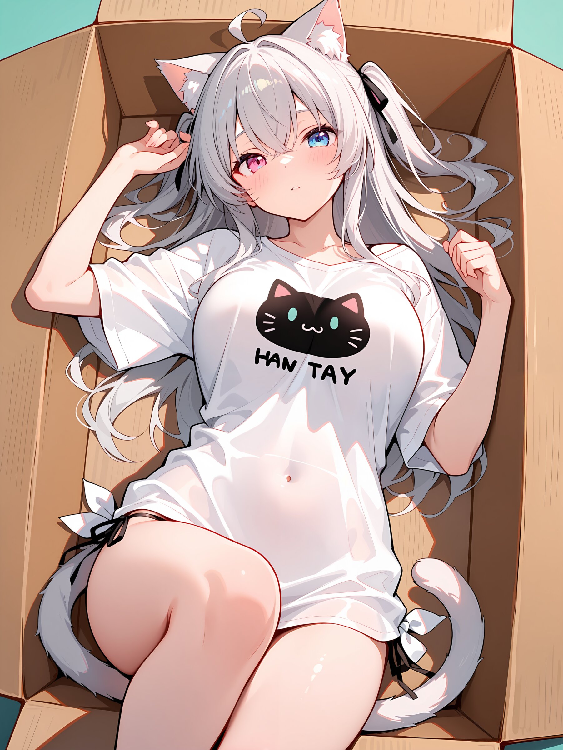 Oversized clothes, T-shirt, side-tie shirt, shirt cat ear, cat tail, in cardboard box,