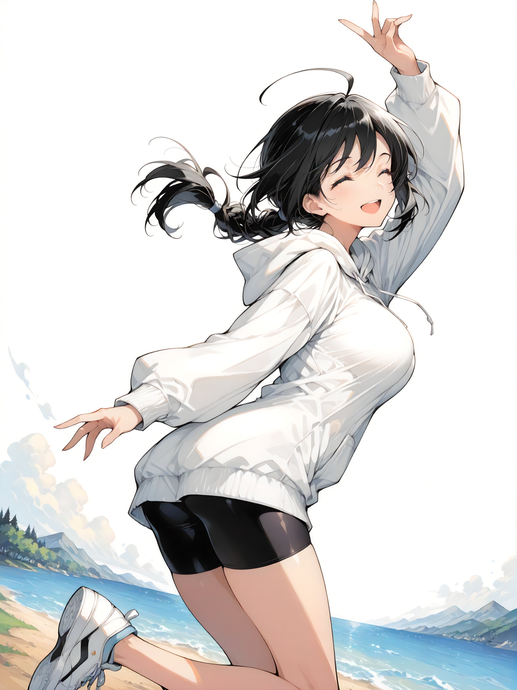 masterpiece, best quality, official art, concept art, a white background with a minimalist design, lots of negative space, delicate anime-style illustration, adventurous spirit, great part of the story, (young girl), cute face and eyes, big breasts, black hair, clear black eyes, braided short ponytail, ahoge, cute and lovely, Vigorous, lively, and spontaneous personality, solo, model pose, cinematic angle, smile, open mouth, closed eyes, official wallpaper, look back, Athleisure look with a white hoodie, bike shorts, and sneakers, Park on a hill with a beautiful view of the ocean