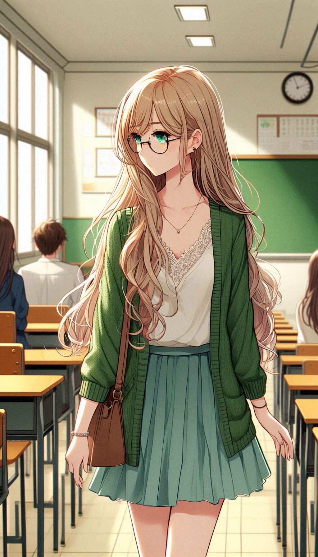 1 lady, long hair, blonde hair, glasses,green cardigan, long skirt, classroom, ,walking, looking away, side view, cowboy shot, anime style