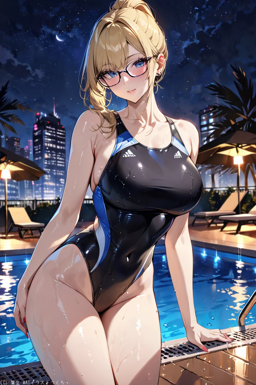 (best quality),(masterpiece),(ultra detailed),1 lady, long ponytail, blonde hair, glasses, cool, competition swimsuit, black swimsuit, night, poolside, big breasts