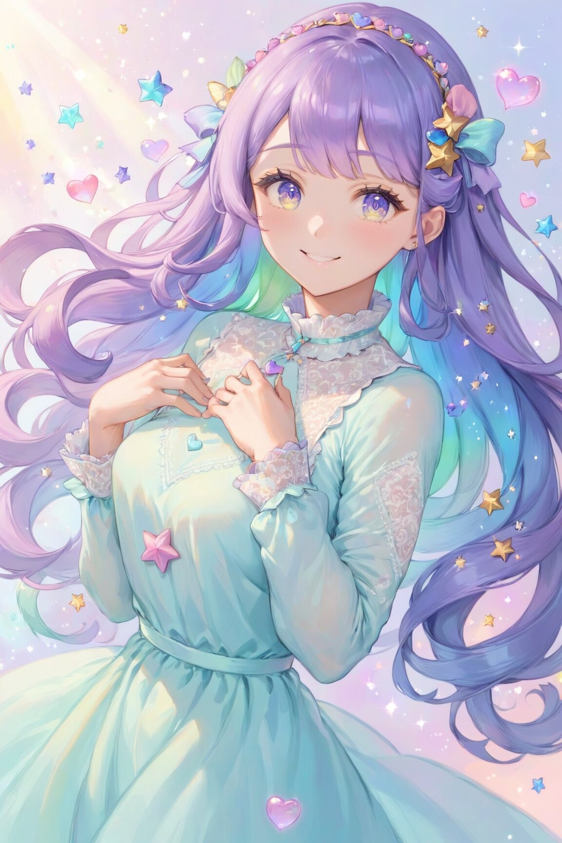 masterpiece, best quality, solo, beautiful girl, gentle and lively smile, soft and modest pose, head slightly tilted, hand gently near chest, sparkling detailed eyes, glossy eyelashes, looking at viewer, long purple hair with light blue inner color, flowing hair, star-shaped hair accessory, elegant pastel dress with high collar and long sleeves, lace details, ribbon accents, soft rainbow lighting, floating pastel hearts and stars, glowing bubbles, dreamy background, yumekawaii style, refined and innocent, soft lighting