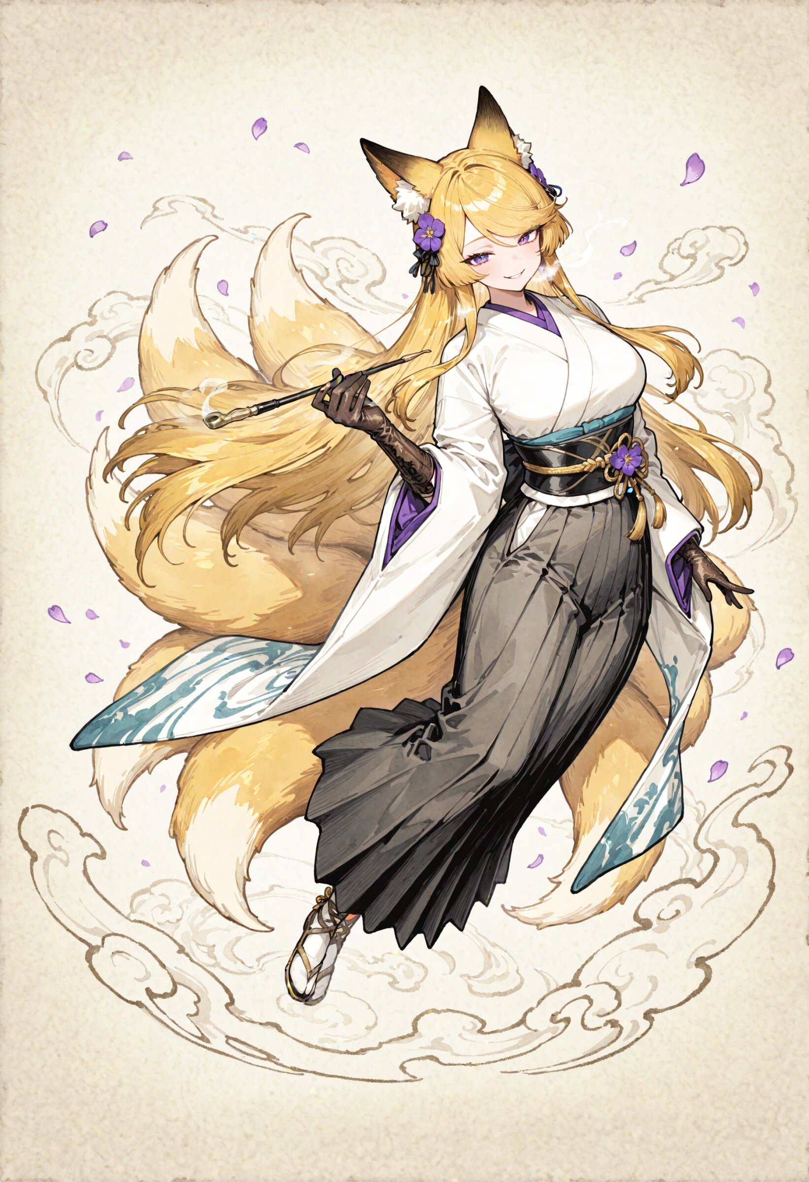 (fisheye,fisheye lens angle:1.0), aerial view, looking down paper background, sumi-e, faux traditional media, color ink \(medium\), painting \(medium\), calligraphy brush (medium), monochrome, spot color, 1girl, fox girl, gold Blond Hair, large breasts and fox ears, (swept bangs:1.2), (perfect violet eyes:1.3) long eyelashes aristocratic features tall girl has (Blond Hair long hair over ears:1.3) fox 9tails, (wearing White Japanese Cloth straw sandal leather gloves long skirt Obi boots:1.3), hair ornament flower, tabi, mysterious atmosphere, seductive smile, holding smoke pipe light smoke breath, cherry blossoms, falling petals, cast a magic, fire magic, swirling fire, magic book, ink wash painting, An illustration with line art drawn using a brush, featuring dynamic movement lines expressed with thick sumi ink strokes. super fine concept art, hard surface, 8K, unreal engine, masterpiece, best quality, amazing quality, very aesthetic, absurdres, you can add scenery, (volumetric lighting), To make the background more distinctive. professional art lots of details, , overexposure, sumie effect style, <lora:noline (1):-0.5> <lora:sdxl2-flat2-512b:-0.5> <lora:facelightup_xl_v10:0.5>