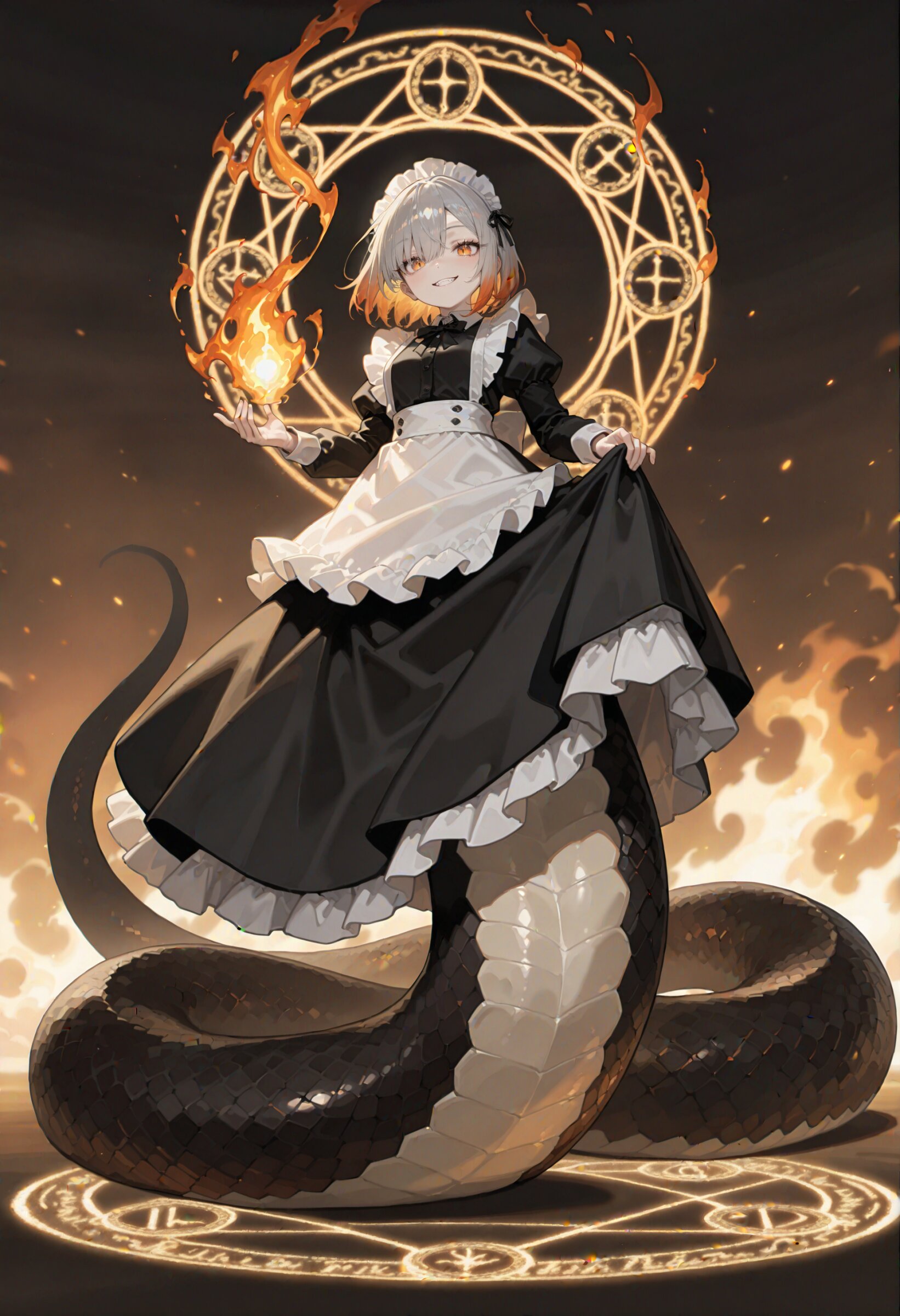 close to viewer from below, looking down (absurdres absolutely resolution:1.2),texture, official art, ultra detailed, unity 8k wallpaper, dark theme, (simple burnt sienna background:1.2), 1girl, (ultra-detailed), solo, maid, pale skin, pale burnt sienna hair, (beautiful slit pupils, naughty face:1.0), long sleeves classic maid uniform, long skirt, maid headdress, maid apron, luminous effect lens flare lotion shiny-glistening cute girl solo full body, standing, crossed legs, skirt lift, graceful courtesy, bowing ((lamia:1.1), slit pupils, , Calisthenics, huge burnt sienna snake leg:1.1), (ultra detailed floating glowing magic circle:1.2), (high saturation) depth of field, bokeh, super fine concept art, hard surface, 8K, unreal engine, masterpiece, best quality, amazing quality, very aesthetic, absurdres, you can add scenery, (volumetric lighting), To make the background more distinctive. professional art lots of details, , overexposure, shiny-glistening, (watercolor style:0.0), (pastel color style:0.0) <lora:noline (1):-0.5> <lora:sdxl2-flat2-512b:0.15> <lora:facelightup_xl_v10:0.5>