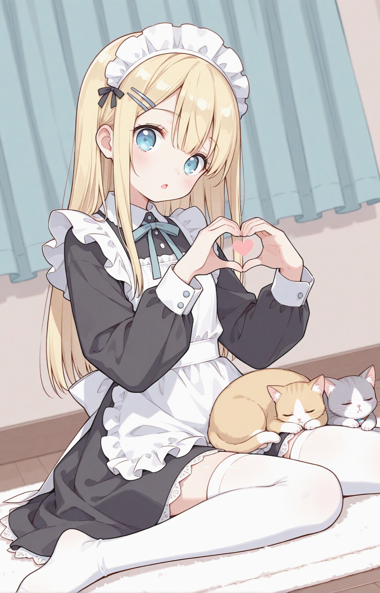(flat color:0.1),(pale color:0.15), (tareme:0.33), cute 1girl , wariza, cerulean eyes, straight hair ,blonde hair ,(hair between eyes:0.5), hairpin,kawaii, (pastel theme :0.3), (depth of field:0.7), (bokeh:0.5),(open mouth :0.0),(excited:0.1) ,(\:D:0.0),(\:o:0.7), (head tilt:0.7), BREAK (sitting with sleeping cat :1.2), 3cats, indoors, white headdress, black maid dress, heart hands, refined , thighhighs, ribbon, ( from side:0.1), ( dutch angle:0.2),(contrapposto:0.9),white carpet,curtains