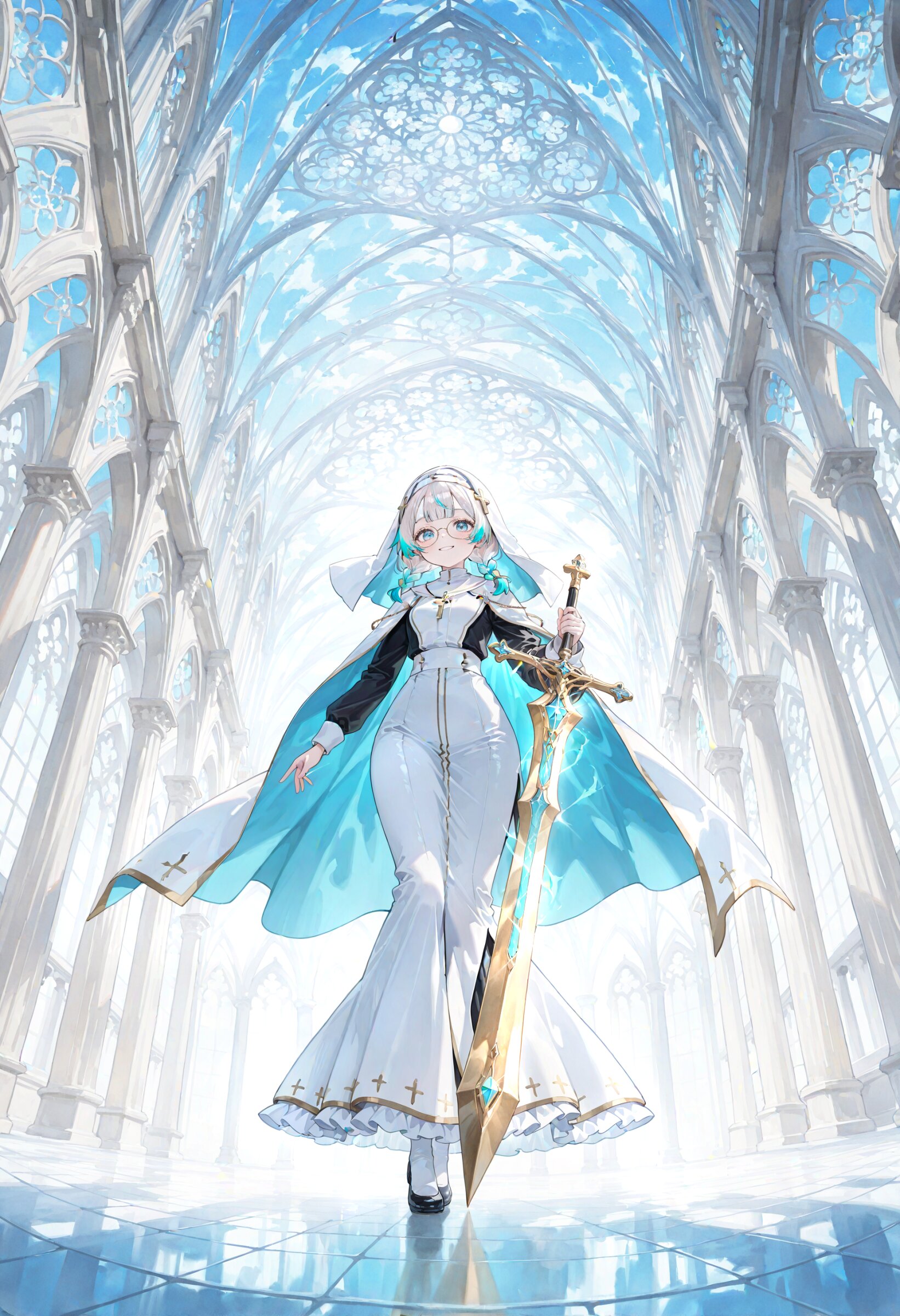 from front (face:1.0) (from below,looking down:1.2) (fisheye lens angle:1.4), looking at viewer, 1girl, nun, beautiful detailed eyes, holy face, cool Elegant and sophisticated demeanor, (pale skin:1.0), skindentation, beautiful aquamarine eyes, glasses , multicolored hair, silver hair, pale blue and copper and ever green hair, medium hair, twin braids center-flap bangs topknot , first-rate female bodies perfect body beautiful small breasts smart hips, (divine,Holy,goddess:1.1),, nun,Gold hair ornaments, white cape, cloak, black religious robe, long sleeves, , , , , , ,, long skirt, frilled skirt, , shiny smile, (smile:1.0), God Light, (intricate), opulent, lustrous, holy outfit, A solemn atmosphere of piety, ascetic manner, outdoors of Cath�drale Notre-Dame de Chartres, , , holding sword, holy light, beautiful morning, divine energy aura, super fine concept art, 8K, graceful eyes, ceiling painting, masterpiece, best quality, amazing quality, very aesthetic, absurdres you can add scenery, (volumetric lighting), To make the background more distinctive. professional art lots of details, , overexposure, shiny-glistening, (watercolor style:1.2), (pastel color style:1.2) <lora:noline (1):-0.5> <lora:sdxl2-flat2-512b:0.2> <lora:facelightup_xl_v10:0.5>