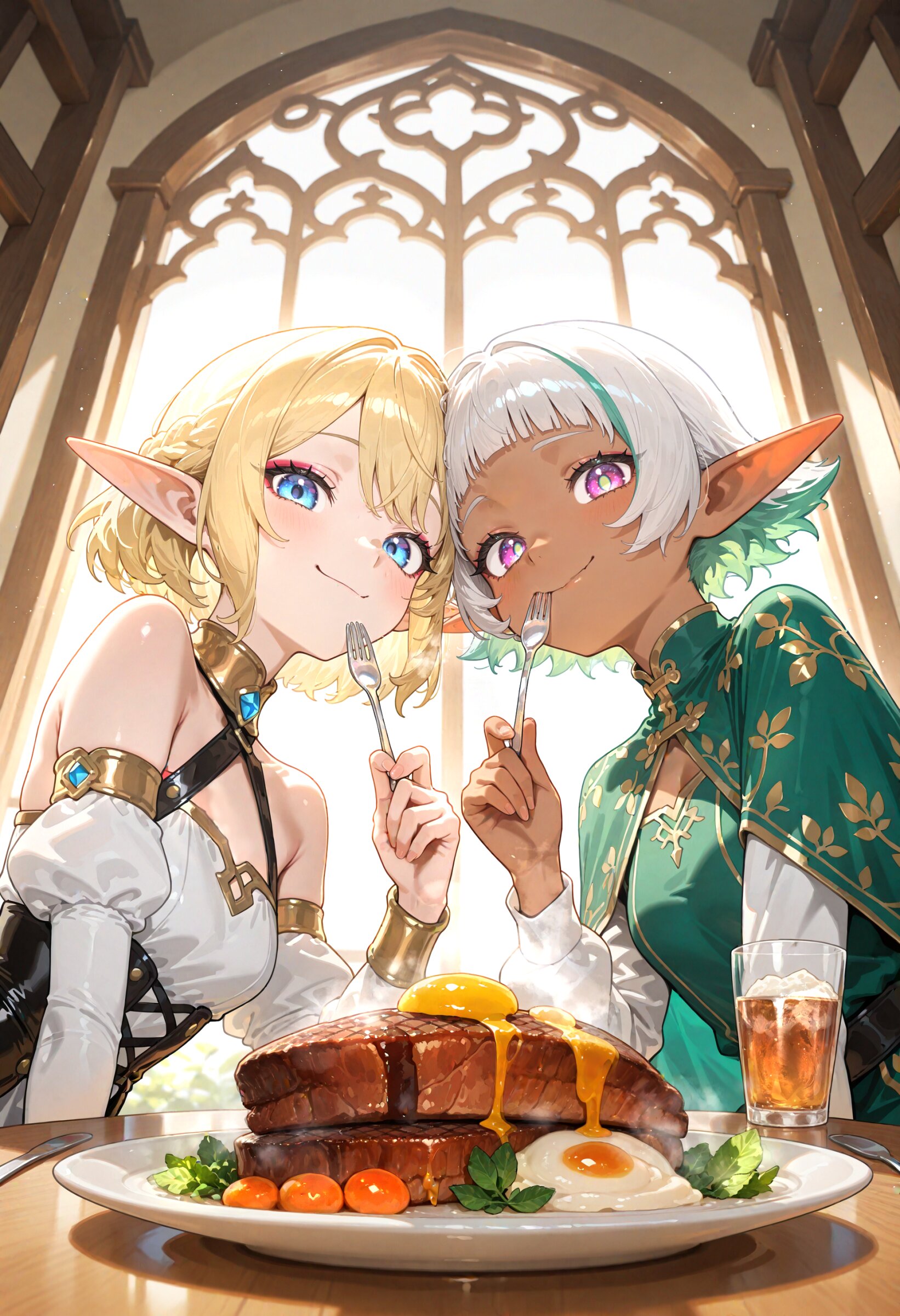 multiple girls, 3girls, (elf girls:1.2), , having a drinking party at a restaurant. (The restaurant's rooftop terrace offers breathtaking panoramic views of the medieval fantasy town:1.0). They are seated around a round table, drinking, chatting, and enjoying their food. Please show their joyous expressions and the sense of camaraderie between them, (noon:1.0), soft natural sunlight, (close to viewer, heads together:1.1), , (from below:1.0), dutch angle, , perfect anatomy, with fork ,spoon, , eating skirt steak on plate, prawn salad on plate, , chicken broth soup on bowl, professional anime art lots of details, , overexposure, shiny-glistening, (watercolor style:1.1), (pastel color style:1.2) you can add scenery, (volumetric lighting), To make the background more distinctive. super fine concept art, hard surface, 8K, unreal engine, masterpiece, best quality, amazing quality, very aesthetic, absurdres, newest, ambient occlusion, raytracing, <lora:noline (1):-0.5> <lora:sdxl2-flat2-512b:0.2> <lora:facelightup_xl_v10:0.5> 文字数制限により省略